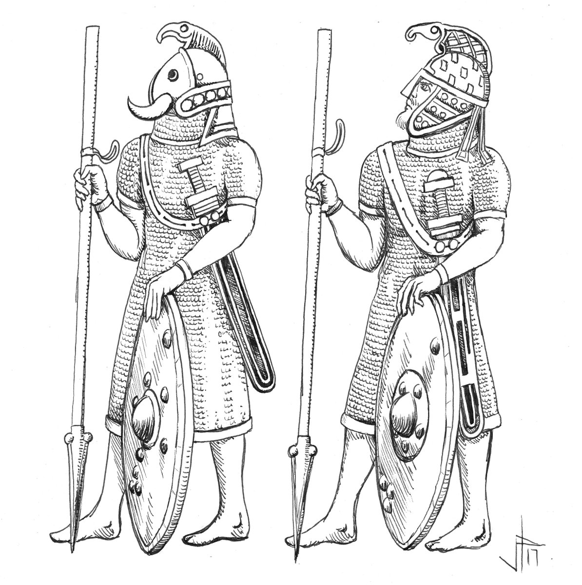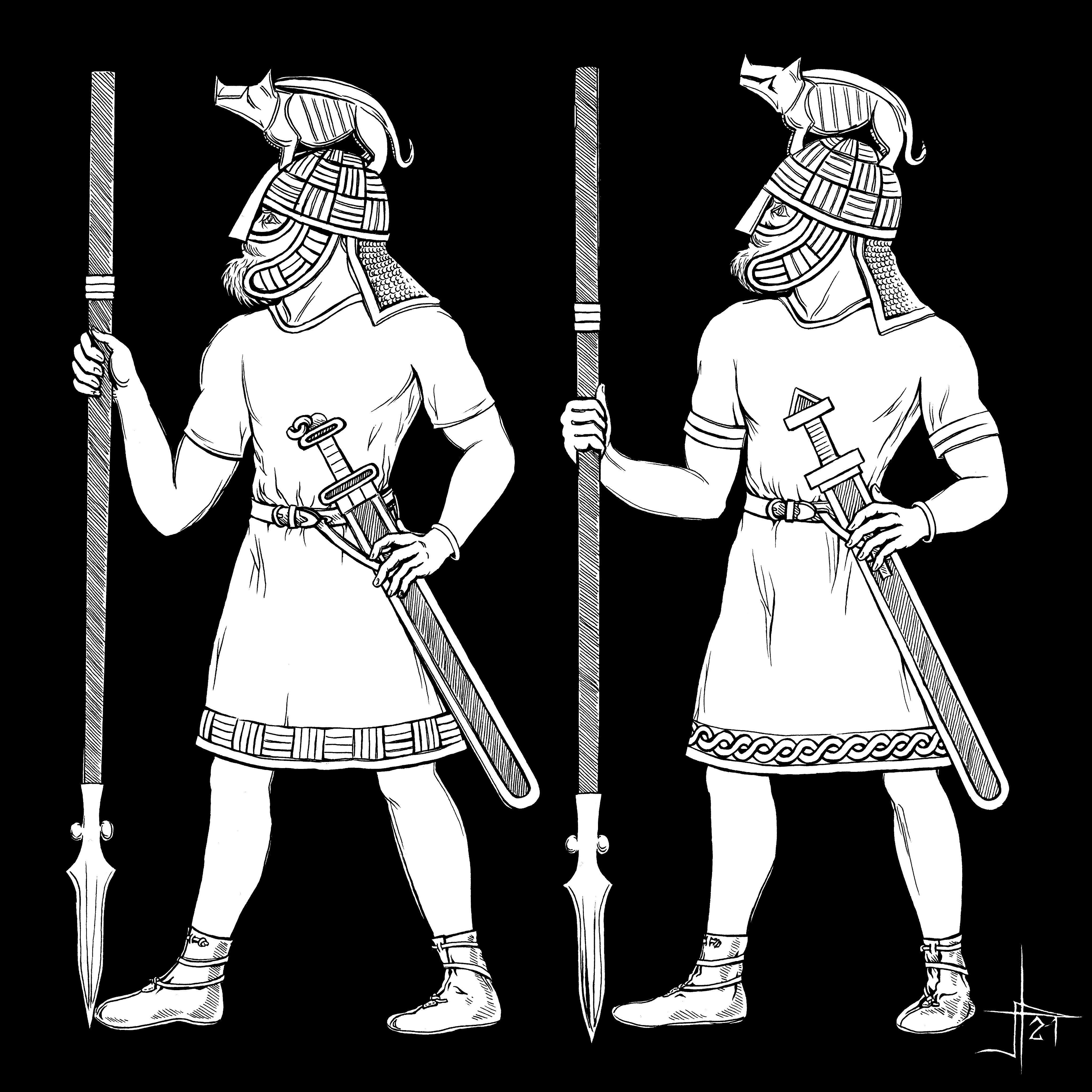 Лошади были крупные, сильные и породистые; их серая шерсть блестела, длинные хвосты развевались на ветру, а гривы были туго заплетены. Всадники были им под стать: высокие, с длинными ногами и руками; их волосы, бледно-желтые, выбивались из-под легких шлемов и были заплетены в косы; лица их были строги и серьезны. В руках они держали длинные копья из ясеня, раскрашенные щиты были заброшены за спины, а на поясе у каждого висел длинный меч, они были одеты в сверкающие кольчуги до колен.