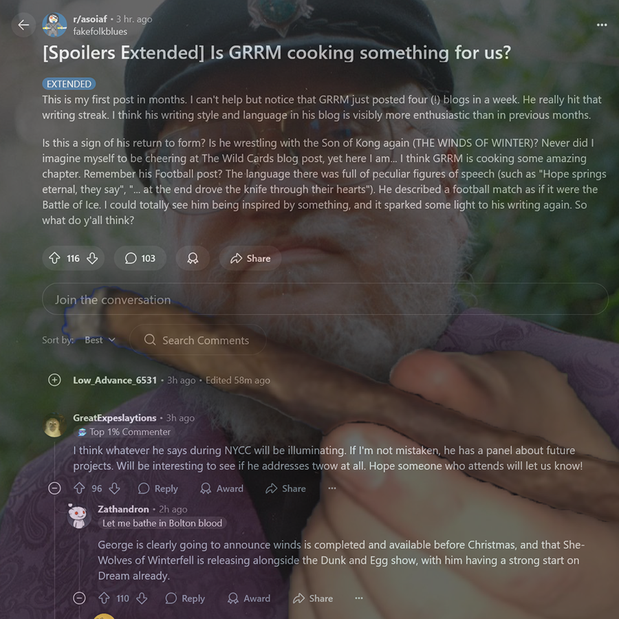 Прежде чем писать глупые вопросы, прочти пояснение: 1) Этот тред НЕ по сериалам Игра Престолов и Дом Дракона. 2) Этот тред НЕ ТОЛЬКО по Песни Льда и Пламени, в частности, не только по её основному циклу. Можно обсуждать и другие произведения автора (хотя этого практически никто не делает).