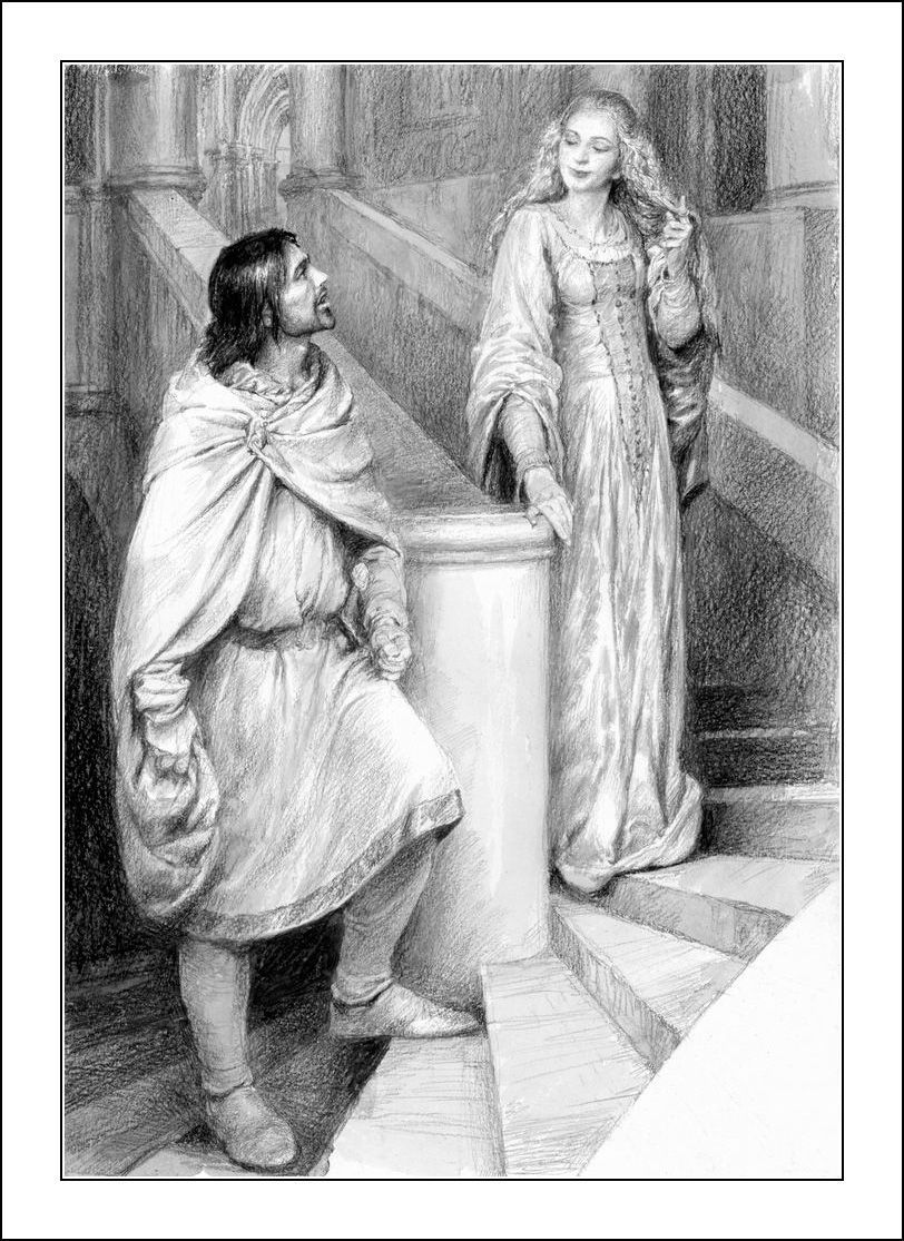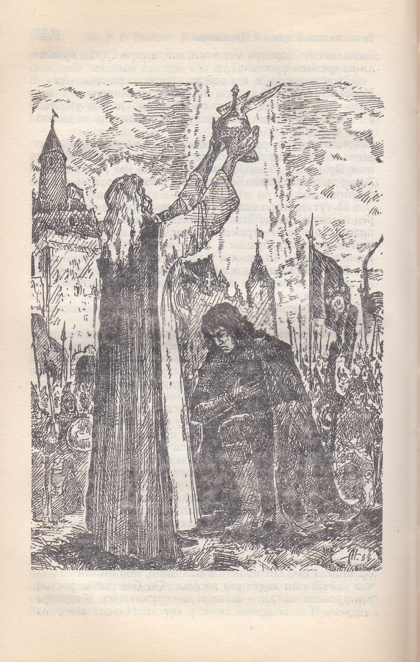 >Потом он подошел к хоббиту и, положив руку на плечо, взглянул в глаза. >– Прощай! – произнес он размеренно. – Прощай, Перегрин, сын Паладина. Недолго служил ты мне, сегодня твоя служба кончилась. Ступай и умри как хочешь. Можешь идти к своему неразумному приятелю, это он привел тебя к гибели. Пришли сюда моих слуг. Прощай! >Пиппин склонил колено. >– А я не прощаюсь с вами, повелитель! – дерзко сказал он, потом вскочил на ноги и посмотрел прямо в глаза Денетору. – Вы правы, мне нужно повидать Гэндальфа. Напрасно вы считаете его неразумным. Разума ему хватит на весь этот Город и еще останется. И пока он не потерял надежды, я тоже не буду думать о смерти. Хоть вы и освобождаете меня от службы, я не хочу быть свободным от своей клятвы. Если врагам суждено ворваться в Цитадель, я надеюсь быть рядом с вами до конца и заслужить оружие, полученное из ваших рук. >В начале его слов в глазах Денетора мелькнуло легкое удивление, но тут же погасло и сменилось усталым равнодушием. >– Поступай как хочешь, Перегрин, – тихо ответил он. – Моя жизнь окончена. Иди теперь и позови слуг, – он слабо махнул рукой и снова сел у ложа Фарамира.
