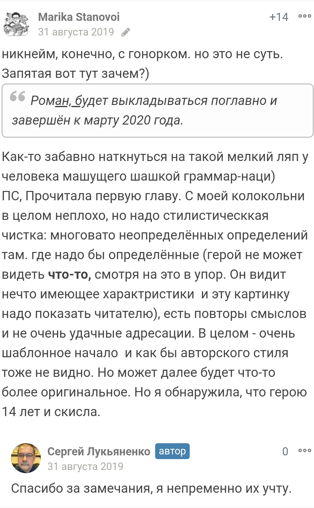 >>628657 >усмехнулся Матвей. >Выражения его лица я не видел Гномы всё так же безмолвно с громкими криками рвутся в атаку, я смотрю. Всё по канонам. А стабильность это, наверное, самая невозможная вещь. Количество идей, которые приходят в голову - ограничено, настроение и продуктивность также нестабильны. Возможна стабильность уровня Донцовой, но этого ли ты хочешь? >Я уже даже не прошу писать интересно Я как-то пробовал писать интересно. Из всего, что понял, это то, что произведение начинает превращаться в ёбаное кружево, где события, персонажи, лор - всё переплетается в общую массу, а дыры это не дыры в сюжете. Их читатель прощает или не замечает вообще, дыры это провисы сюжета, в которых нет новых нитей с интересными поворотами или персонажами. Насыщенность текста должна быть на таком уровне, будто ты написал в 10 раз больше, а потом выпарил воду. Теперешний же автор живёт за счёт воды, это его хлеб с маслом. Потому что объём превыше всего. Но даже так мне сказали, что читать мой стиль тяжеловато.
