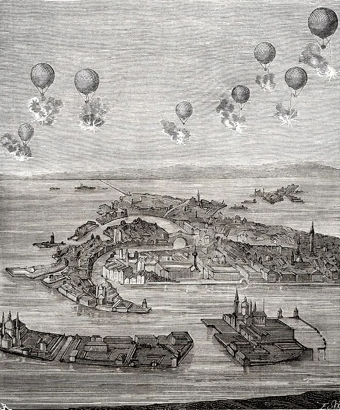 >>625670 >>625672 Кстати, вот что ещё вспомнил: Первая попытка использовать аэростаты в боевых целях была предпринята 12 июня 1849 года, когда два бомбардировочных аэростата были запущены по Венеции[1]. Из-за сменившегося направления ветра бомбы не достигли цели[2]. Попытка была повторена 15 июня, с запуском двух аэростатов с борта военного парохода. На этот раз всё прошло удачно — аэростаты долетели до Венеции, и в расчётный момент часовые механизмы сбросили на город шрапнельные заряды.