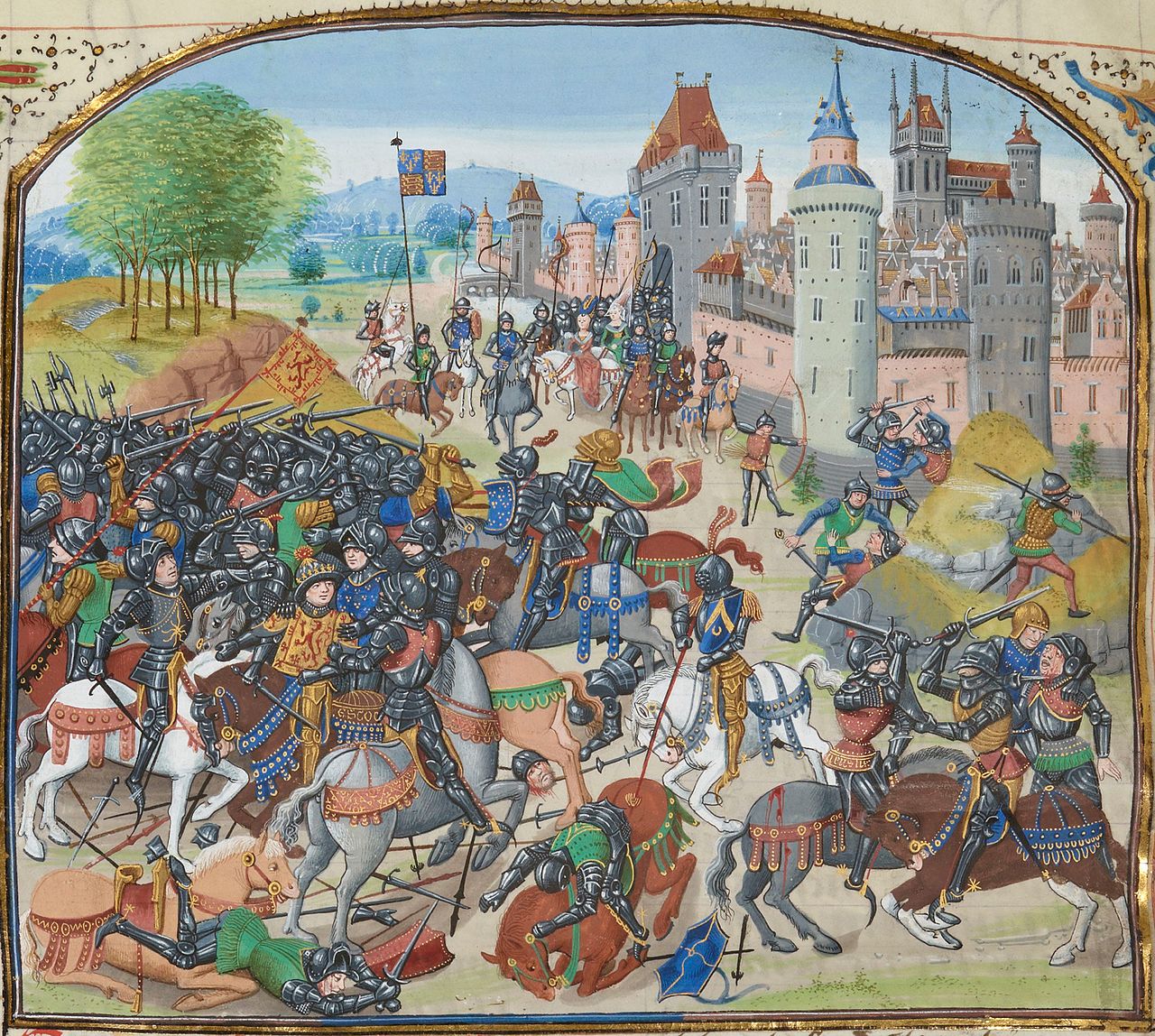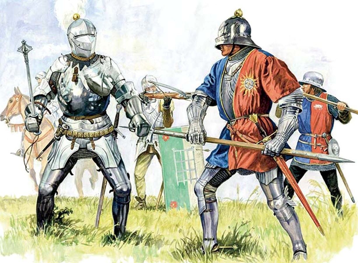 Вот смотри - изо из ирл. Что видим: укол меча пробивает кирасу/бригантину, наносит рубленые раны через шлем, мечи со щитом/баклером - стандартное оружие рыцаря/man-at-arms (фиг знает, как на русский перевести, "тяжёлый воин"?). Алебарда одна- на земле валяется.