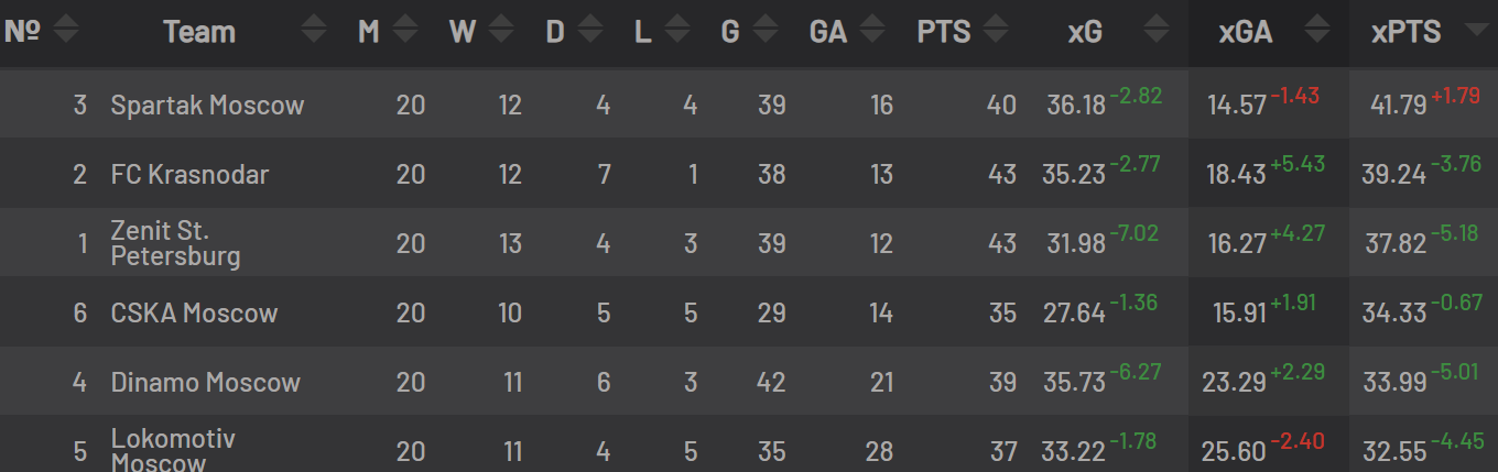 Хотя и является научным фактом, что хорошего человека красным не назовут, но Спартак по-прежнему чемпион в лиге xPTS, потому что играет в красивый (как я) атакующий футбол! Поразительно, как этот великий клуб не привёз в Россию ни одного международного кубка? Видимо пока что далеко до Зенита и ЦСКА, но не надо опускать руки и ноги