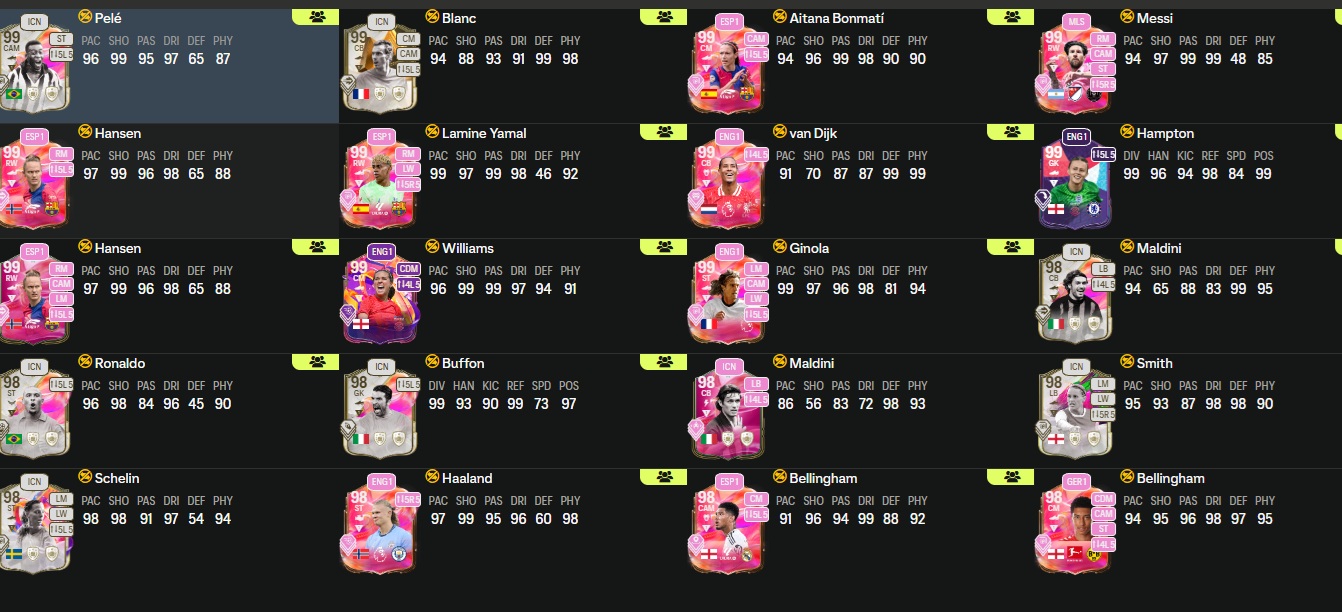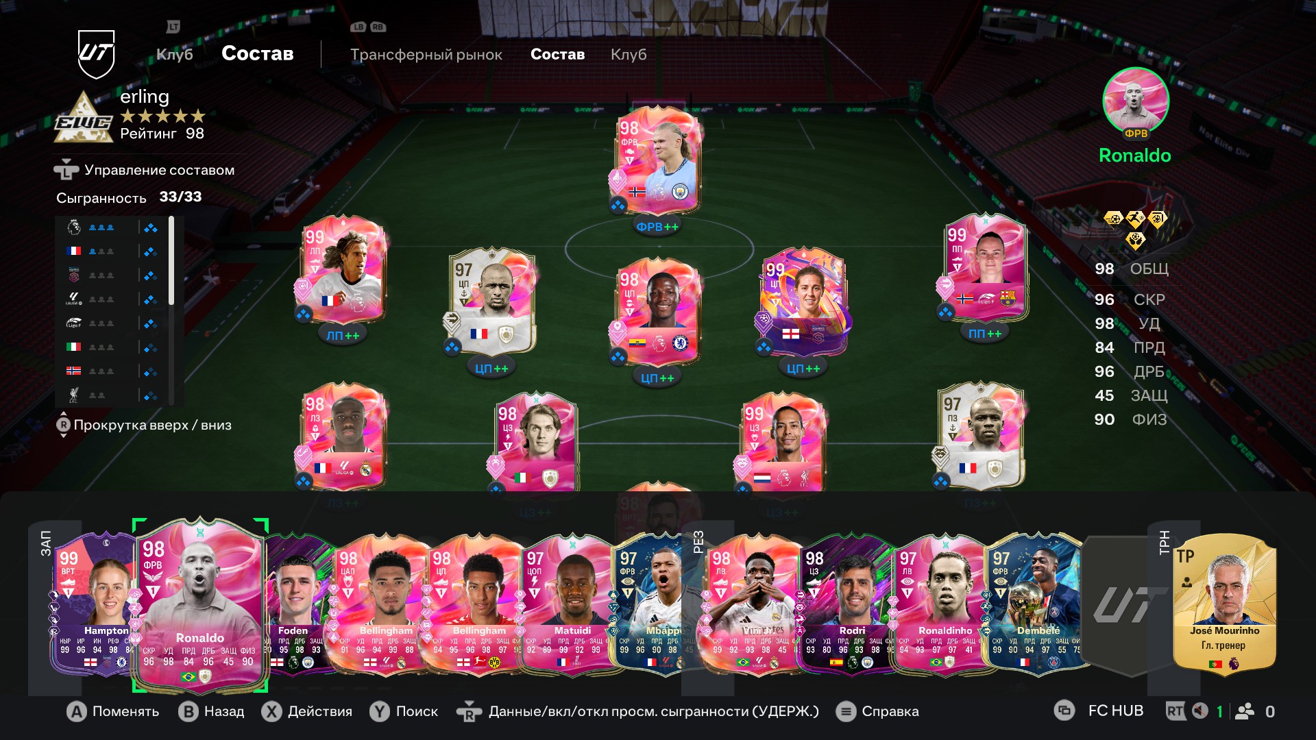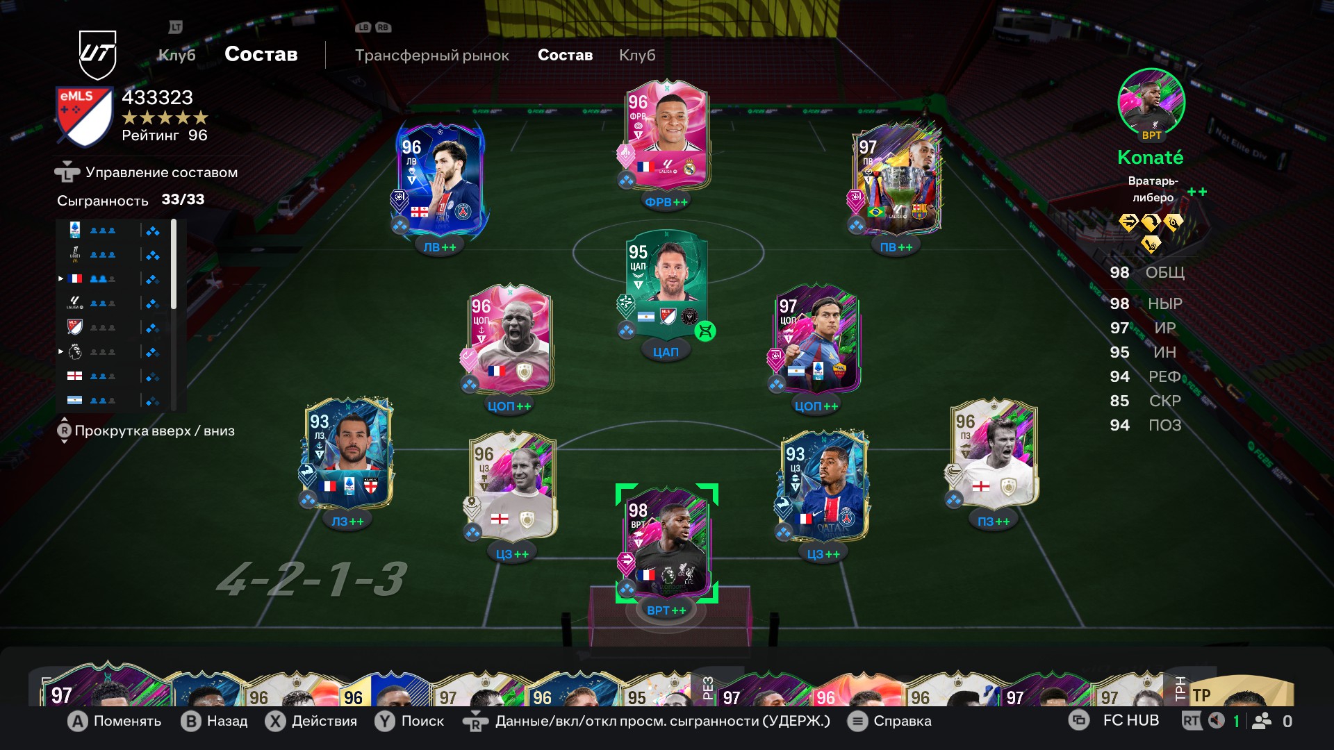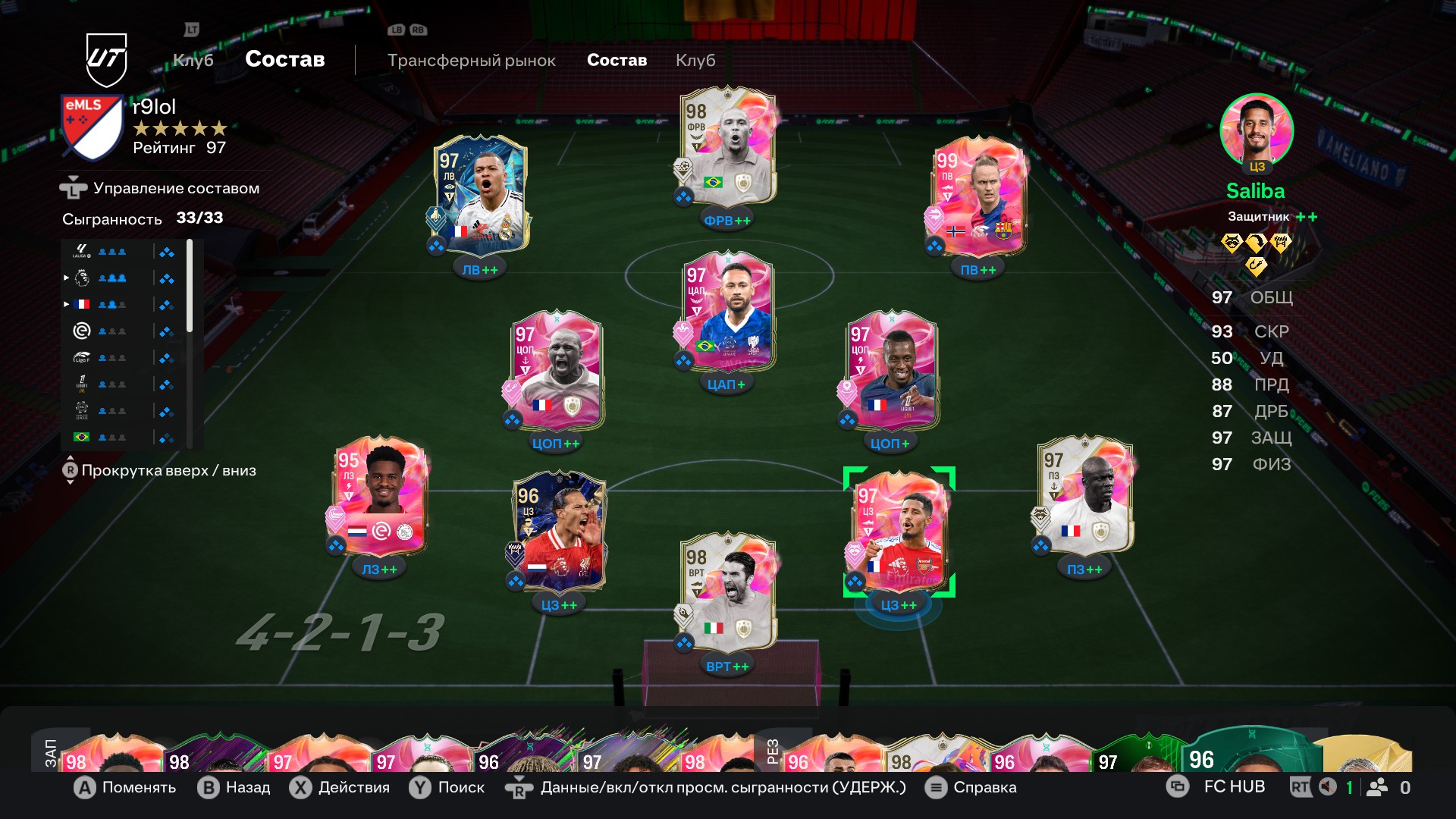 Собственно отыграна ВЛ была примерно таким сквадом, Матьюди заменил Гуллита из-за эволюции, очень хотелось поиграть за эту карту, плюс менялись ЛЗ, пара ЦЗ от Упы до Дейка и Тчуамени, вратари тоже не были неприкасаемыми и стояли как говно по очереди. Справа в атаке в старте выходили трое Р10, Мбаппа, Винисиус 98, но Мбаппа себя проявлял лучше, забивая больше, но все равно чувствуется, что он не такой резкий как я хотел бы от вингера. Хансен 99 - это какой-то прикол, первых матчей 10 вообще ничего не могла забить, отдать, но потом вроде прорвало. Зубастик конечно классный, но какого-то ВАУ-эффекта нет, когда я обычного мбаппу поймал и им играл с эволюцией кайфа было больше. Достаточно жидкую стату показал, у Мбаппы было наверное на десяток голов больше, а то и на два. Но главной звездой сквада стал Неймур, просто лучшая карта, матча 3-4 выиграл забивая в клатче на 90+ минутах, стата просто космос для чела без роли ++ на оттянутом форварде. Вот за эту карту одно удовольствие играть. Тюрам - ебаное посмещище, которое возили все правые вингеры сопов, постоянно теряет позицию, постоянно не может никого догнать, пиздец просто.