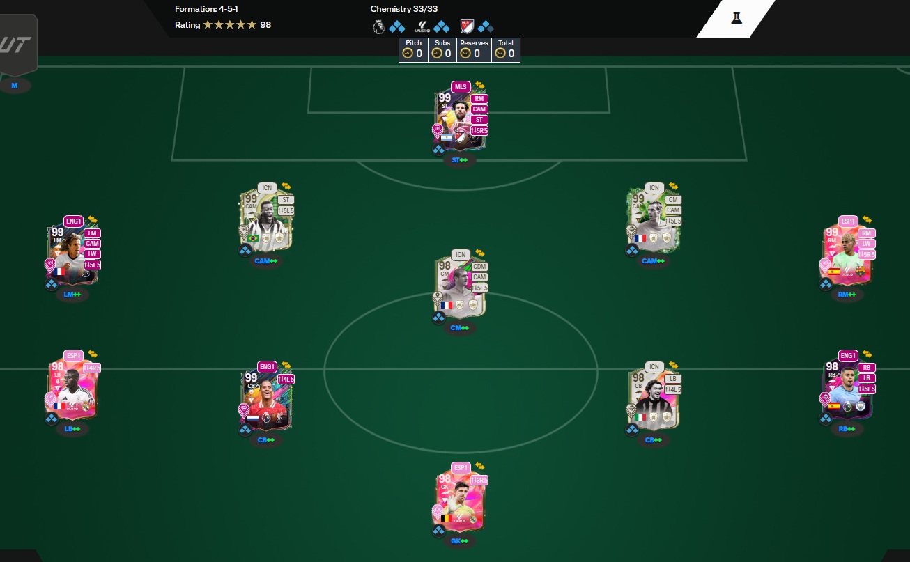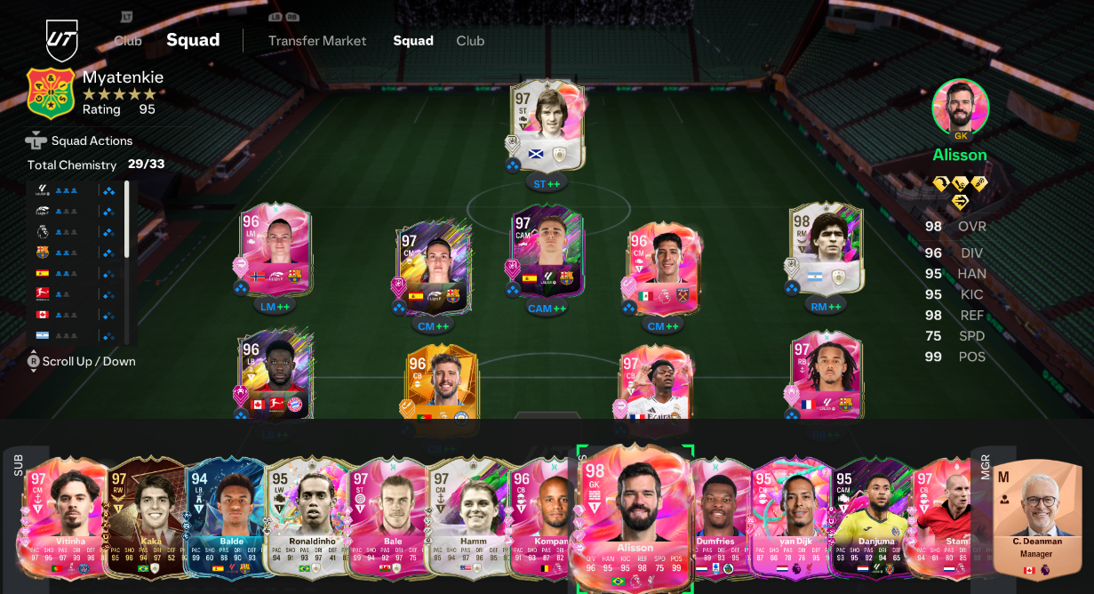 Мой 99 состав. Такая полубарса + те, за кого было кайфово играть. Мне из 99 карт только Салах и зашел. Даже больше, чем Рональдиньо. В египтянине как будто больше магии (но все еще меньше, чем в Хансен)