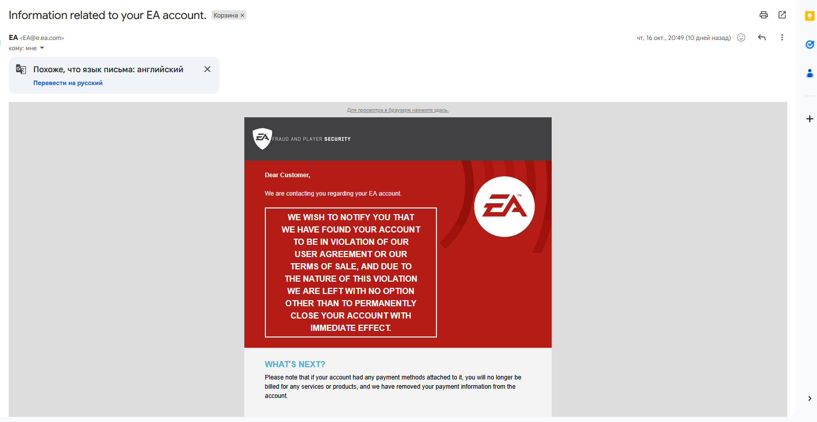 Вот и итог этой части, лол. Я поиграл где-то дней 10 и игру удалил, и получается через 2 недели после этого пришло письмо о блокировке аккаунта. Это новый акк, создавал его для покупки игры на китайском стиме.
