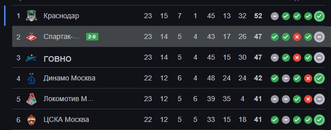 Да и так всё ясно с этим газпром-чемпионатом Всякая махач калы раздвигают ноги перед говнитом Но против Спартака всегда стоят насмерть У клубов из нижней части таблицы лишь одна задача - Слить без боя говниту и отобрать очки у Спартака