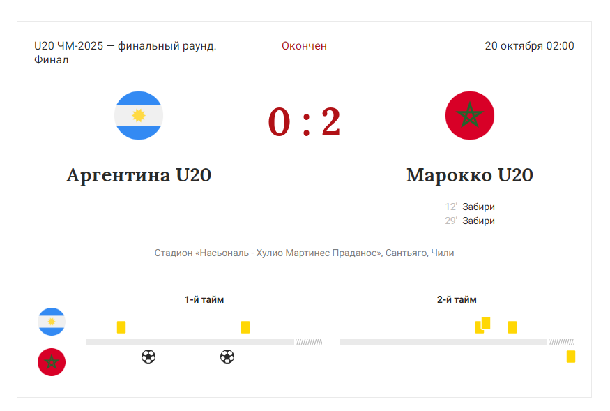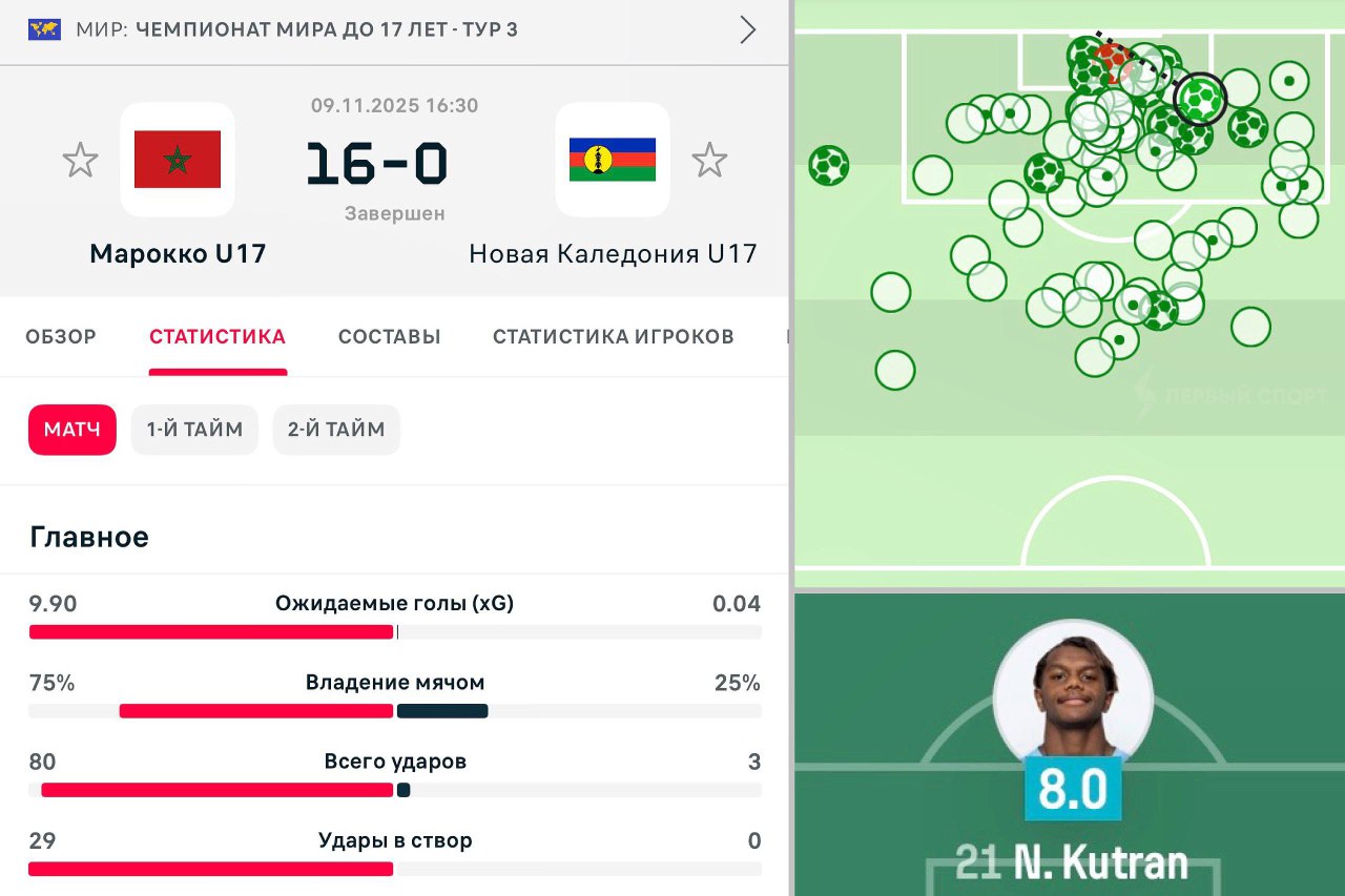 Сборная Марокко нанесла рекордные 80 ударов по воротам на ЧМ по футболу до 17 лет: марокканцы разгромили Новую Каледонию со счётом 16:0, хотя перед решающей игрой группового этапа соперник был выше них в таблице. Ещё ни разу в истории ни одна команда не наносила 80 ударов и не набирала 9,90 xG за футбольный матч на турнирах ФИФА. Лучшим игроком матча в сборной Новой Каледонии стал вратарь, пропустивший 16 голов: Николас Кутран получил оценку 8.0, сделав 14 сейвов