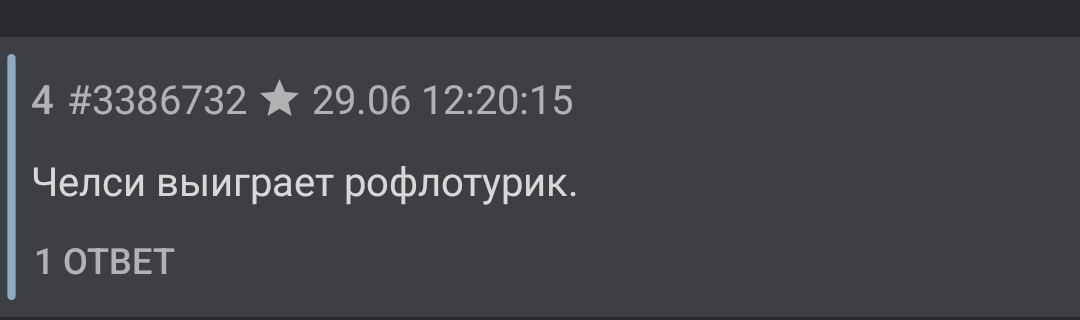 Ну псж конеяно будет мощным соперников. Но все шансы на победу у Челси есть. Все равно в треде нет фанов псж, так что можно притопить всем тредом за великий Челси. Понимаю что тут многие ненавидят синий клуб почему-то, но это не значит что надо болеть против него