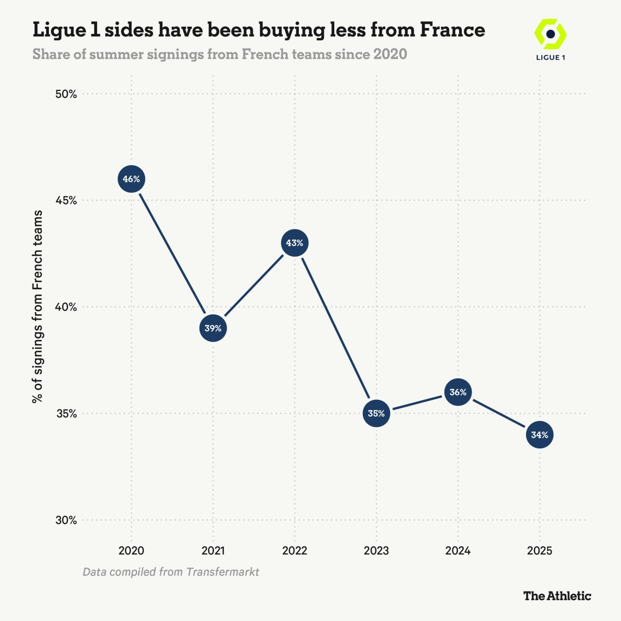 🇫🇷 В Лиге 1, напротив, всё меньше доверяют соотечественникам. С 2020-го доля доморощенных игроков, купленных в ТО, снизилась на 12%. Зато стали брать на «перевоспитание» заблудших талантов из Англии, причём как из элиты, так из Шипа.