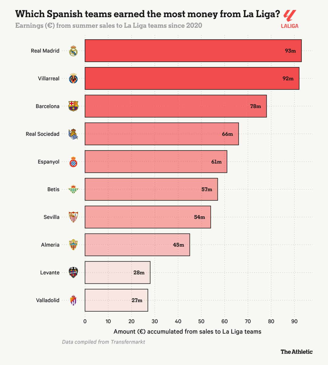 🇪🇸 Что до Ла Лиги, 52% летних трансферов носят локальный характер. Это, на секундочку, самый высокий показатель среди четырёх ведущих европейских лиг (АПЛ, напомню, мы не рассматриваем) с 2020-го. Забавно вот что: «Реал» не просто тратит, но ещё зарабатывает на внутреннем рынке: за последние пять лет никто в Ла Лиге не продал соседям по чемпионату больше, чем «сливочные».