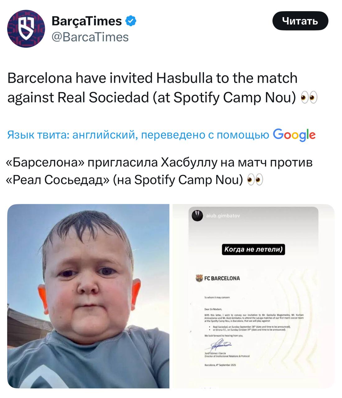 «Барселона» позвала Хасбика на открытие «Камп Ноу» после реконструкции: каталонский клуб пригласил блогера из Дагестана на матчи с «Реал Сосьедадом» и «Жироной» – 23-летнему Хасбику пришло персональное письмо от «Барсы». Клуб возвращается на «Камп Ноу» впервые с 2023 года и фактически будет играть на стройке: над ареной всё ещё стоят башенные краны, а верхний ярус и крыша стадиона не построены
