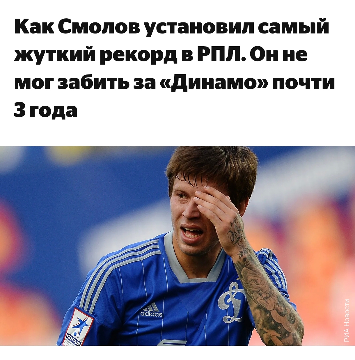 >>3400394 > В мае 2011 Смолов забил победный гол «Краснодару», но следующий гол в РПЛ смог оформить лишь в апреле 2014. Сухая серия Федора составила 45 матчей (1775 минут) — абсолютный рекорд (точнее, антирекорд) в истории РПЛ.
