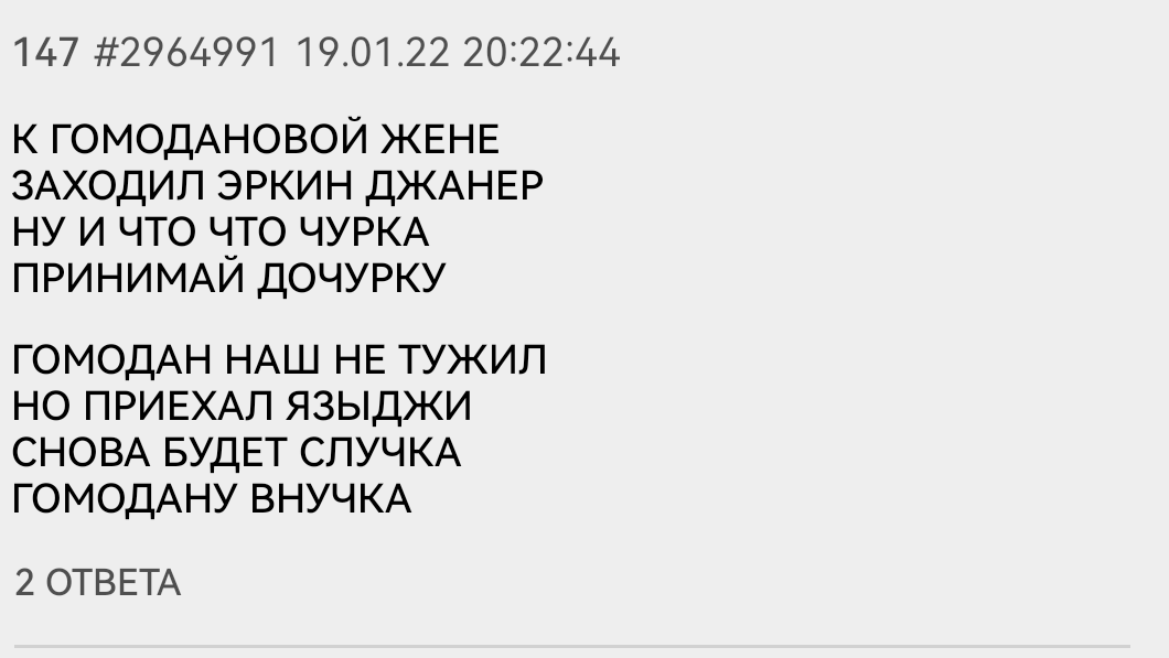 >>3400543 Долбоеб . Человека уже года три тут нет ,он уже женился и в Питере в департаменте полиции хлебное место занял. Люди видели как они с женой с евроспара к себе в мерина s класса покупки складывали.