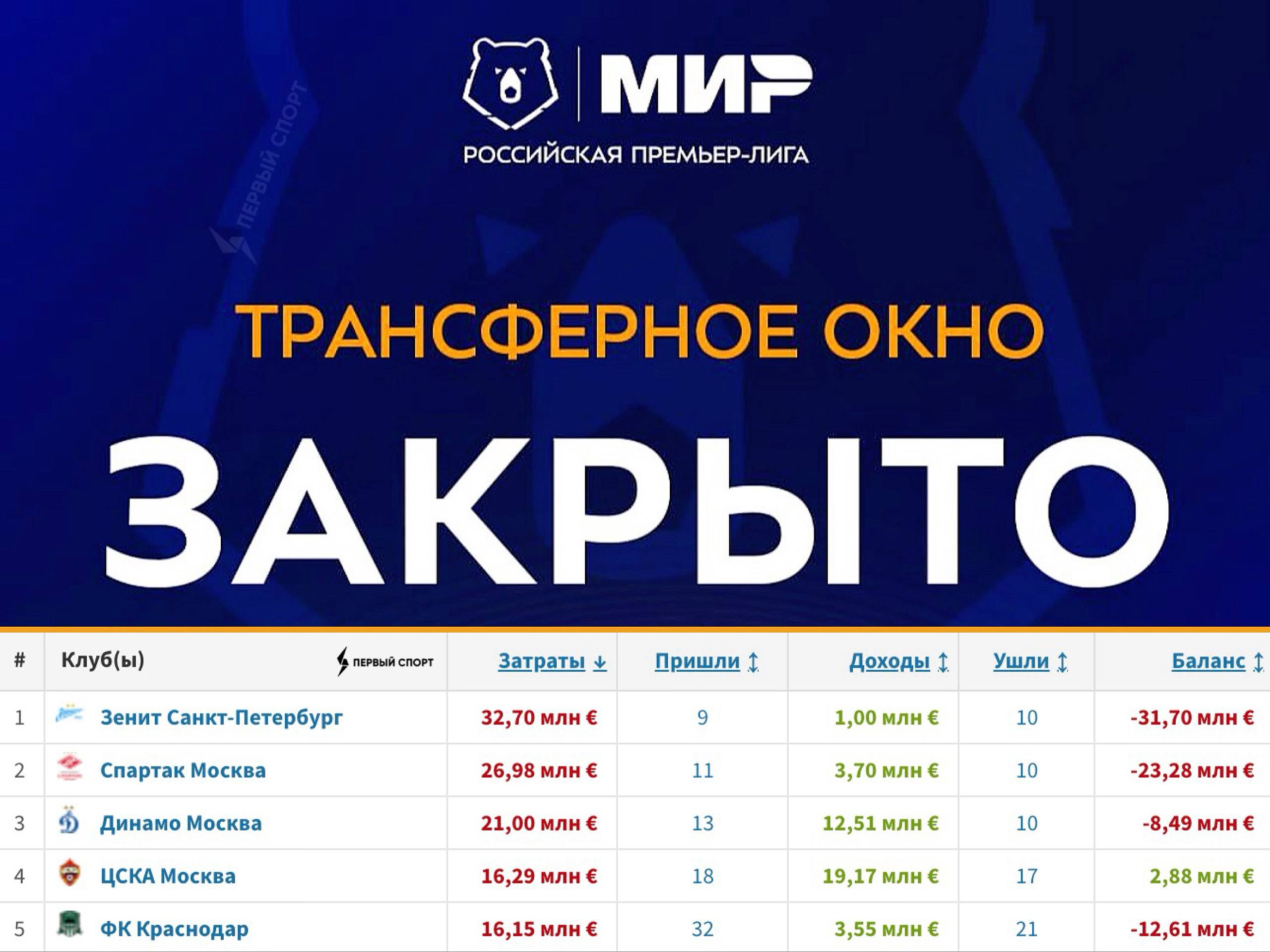Помогите Даше найти клуб, который приносит прибыль > В России закрылось летнее трансферное окно: больше всех потратил «Зенит», купивший игроков на 32,7 млн евро. Больше всех заработал ЦСКА, продавший игроков почти на 20 млн евро. Самым дорогим приобретением лета в РПЛ стал переход Жерсона в «Зенит» за 25 млн евро: самой дорогой продажей – трансфер Карраскаля из «Динамо» во «Фламенго» за 12,5 млн евро