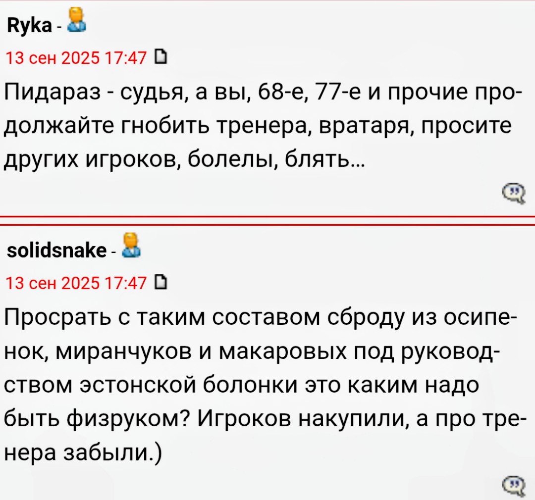 ❗️У «Спартака» отвратительное качество игроков. Блть, какой-то жирный свин в воротах. Просто комедия, блть. Такой свиньи, блть, не видел ни разу. Даже в «Спартаке». Денисов, которому еало разбили… Кто его, блть, в футбол играть учил? Такое же дерьмо, блть – какой-то Литвинов. Хй пойми… Какие-то выкидыши, науй, футбольные. Кто набирал это – непонятно. Тренер у них – психопат, это видно. Больной человек. Так люди здоровые себя не ведут. Надо какое-то успокоительное ему лошадиное уколоть в попку. […] «Динамо» – говно. «Спартак» – говно. Два говна. Обоих тренеров надо в отставку. Один – психопат, другой – ёнутый, припиднутый — стример Илья Мэддисон