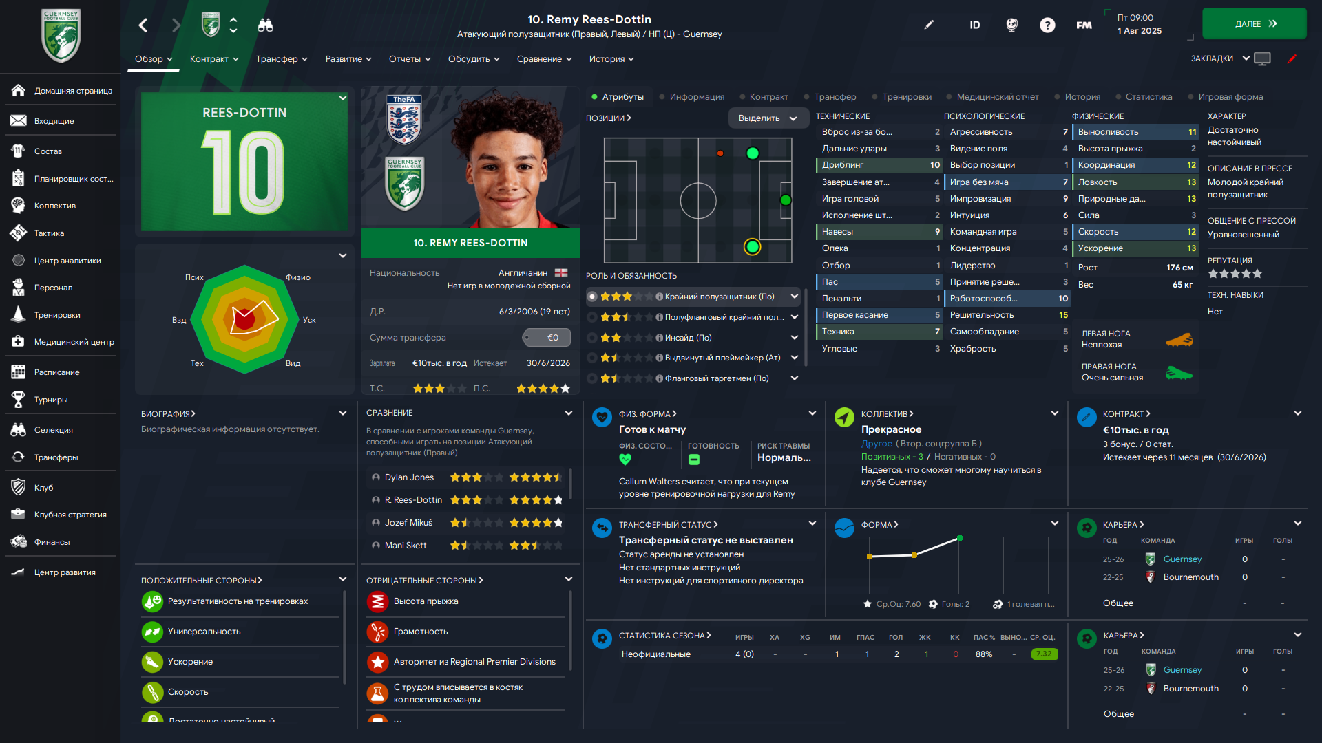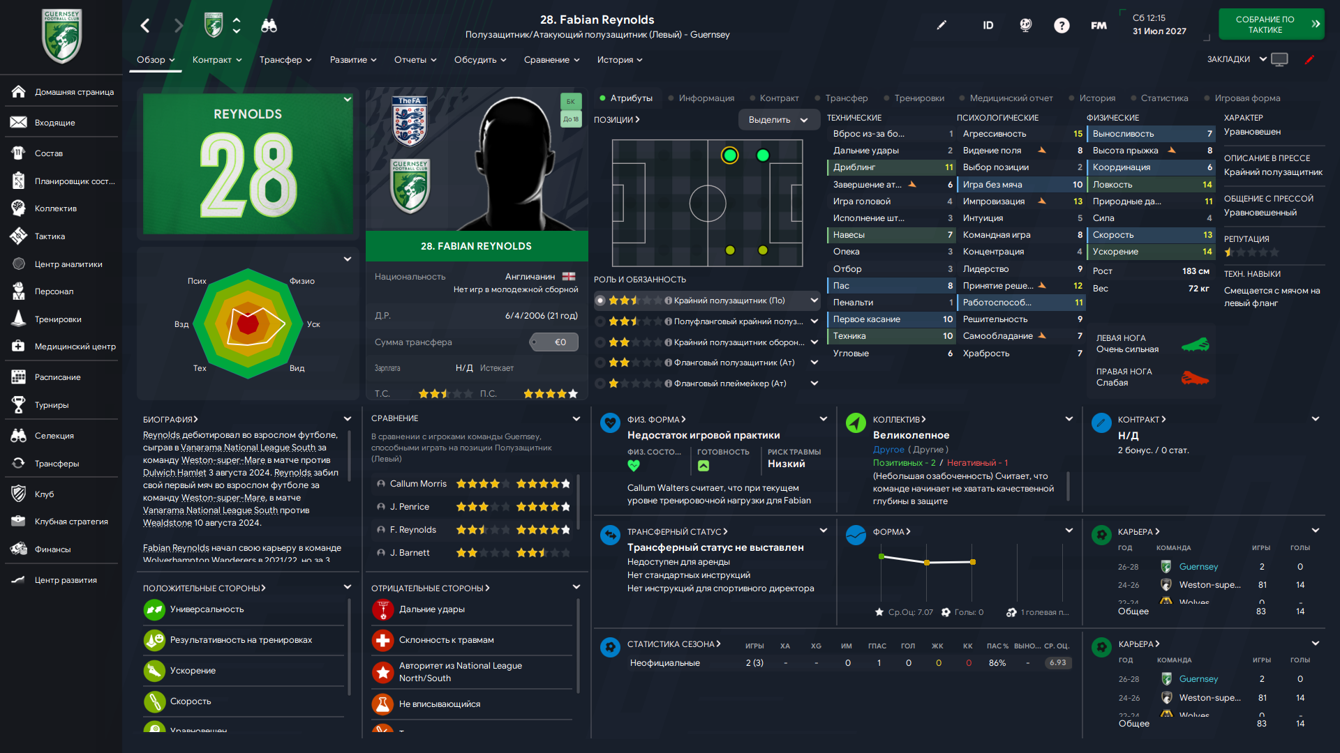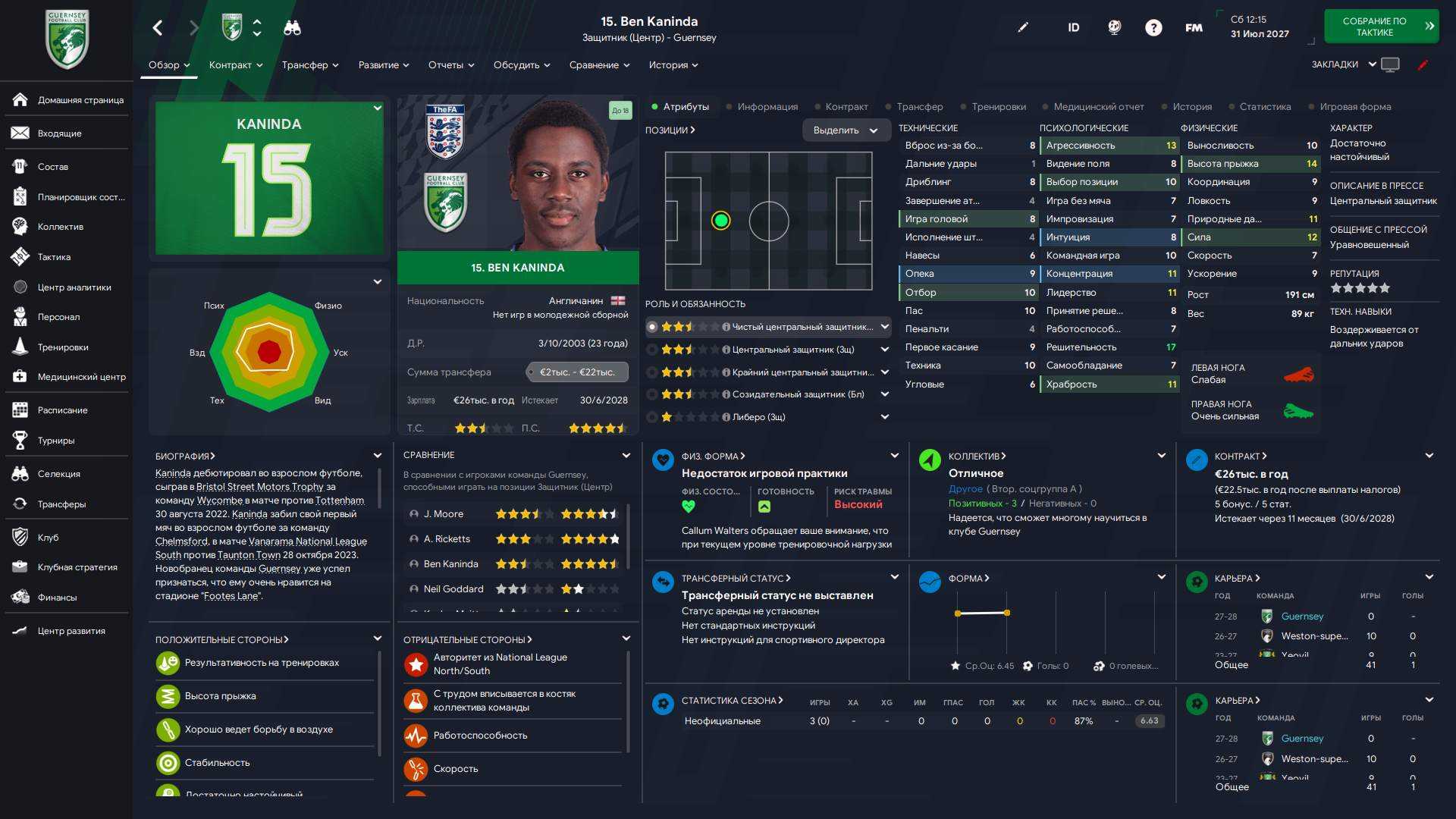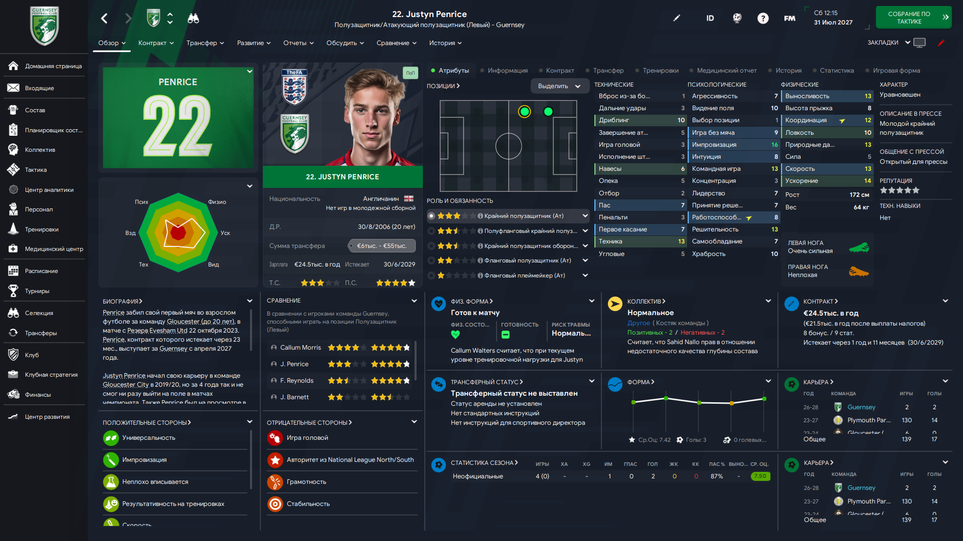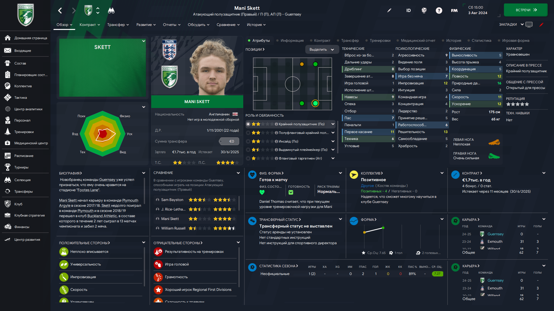 Физически развит, остальное наработаем, надеюсь. Сделал 14 ассистов в 7 дивизионе, к нам перешёл почти за 6 тысяч евро.