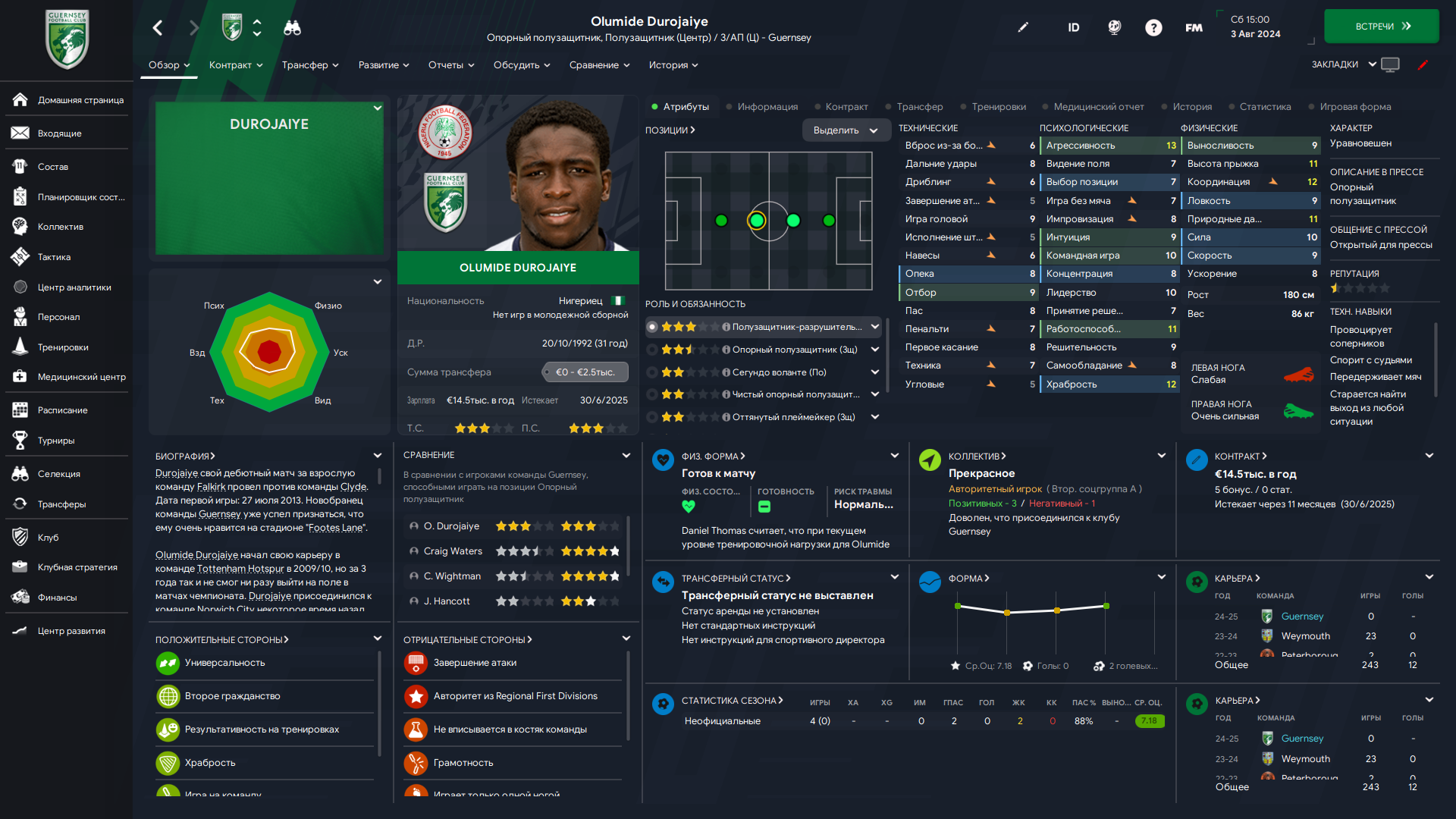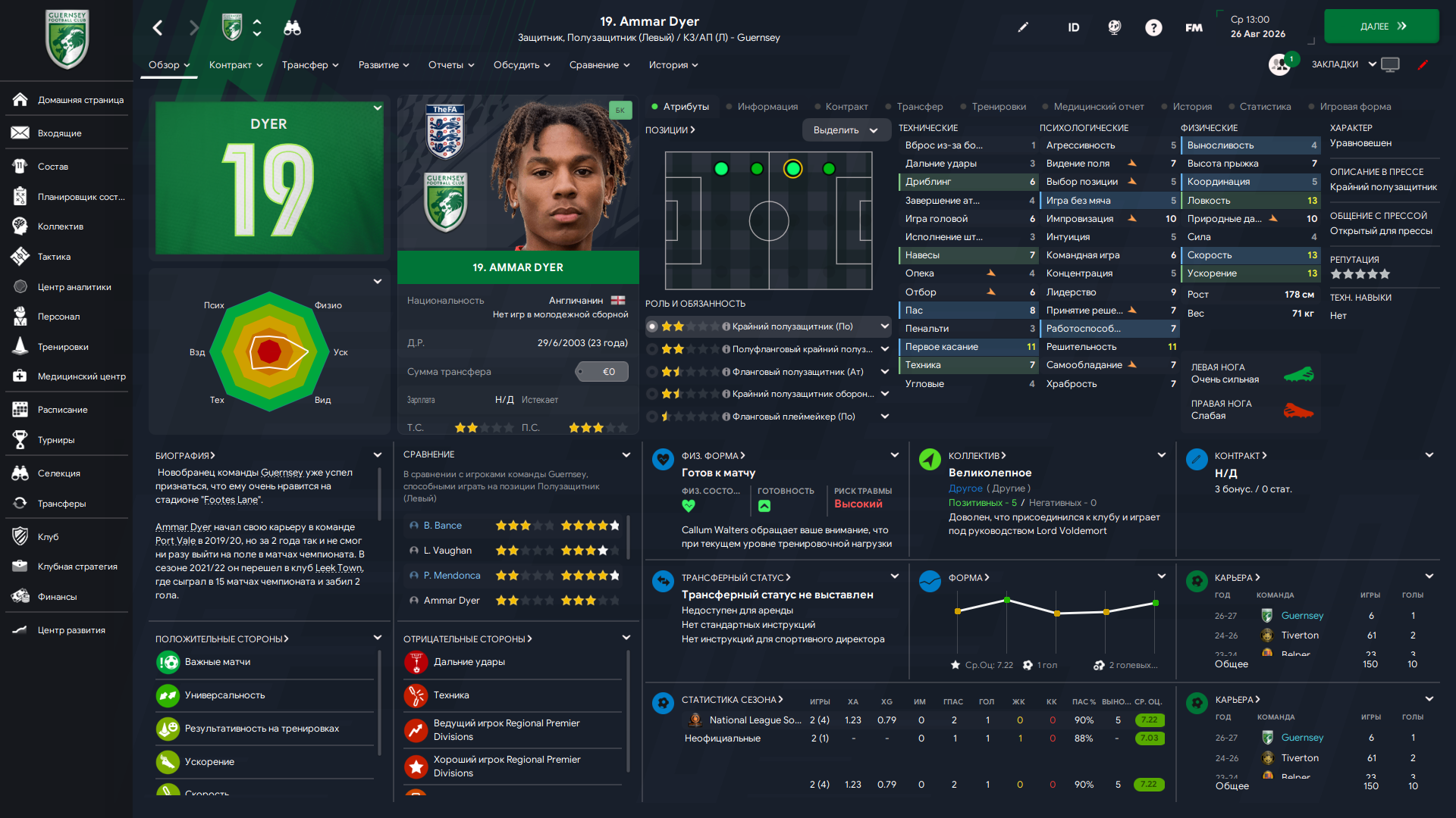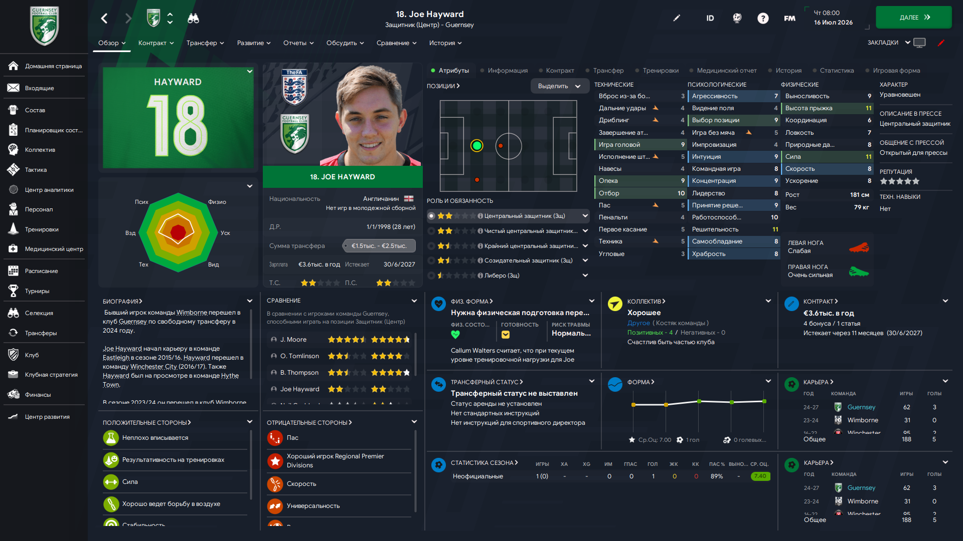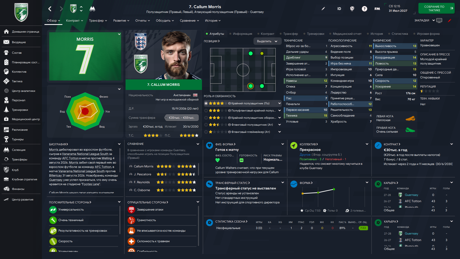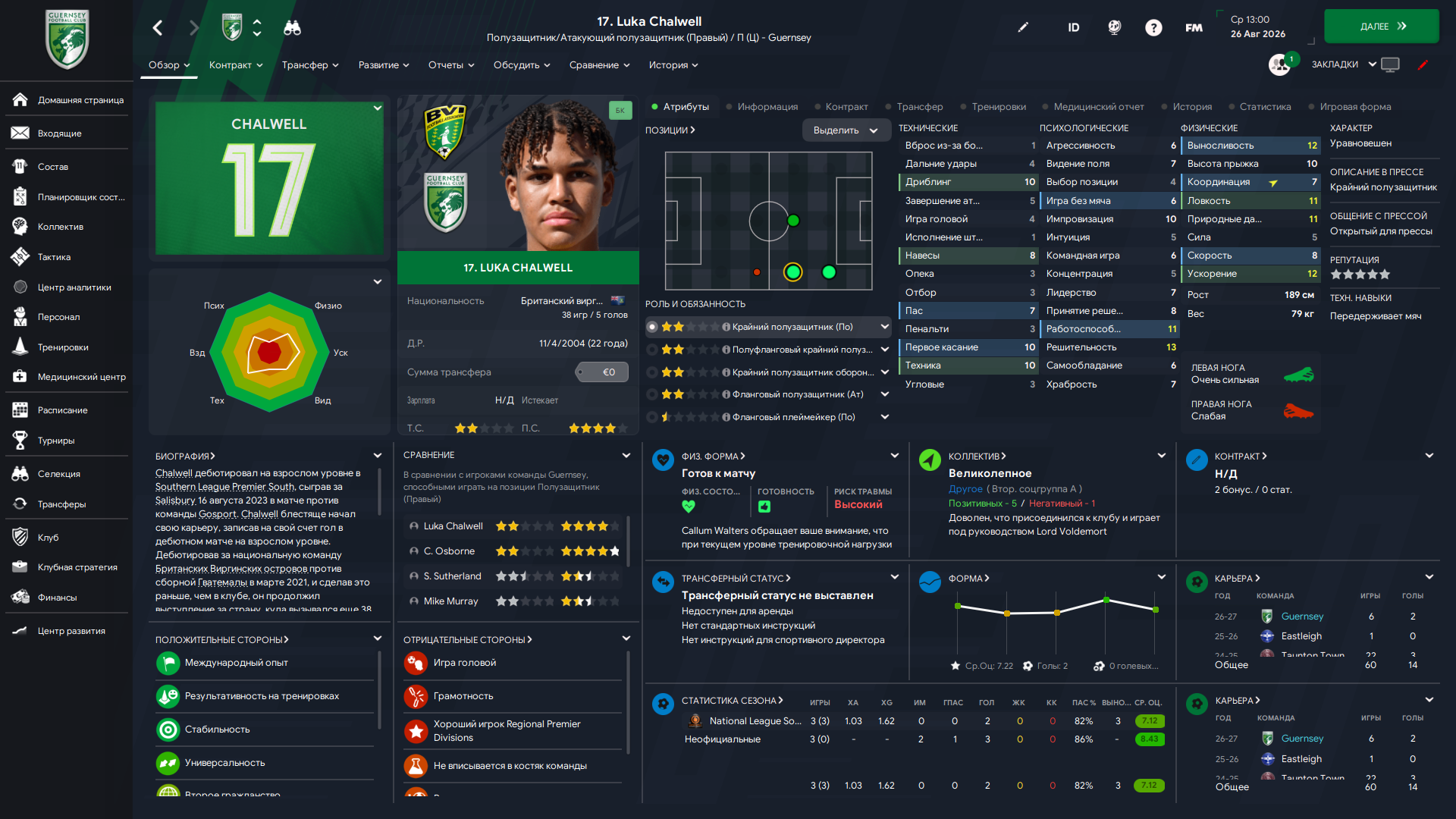 Физически развит, остальное наработаем, надеюсь. Сделал 14 ассистов в 7 дивизионе, к нам перешёл почти за 6 тысяч евро.