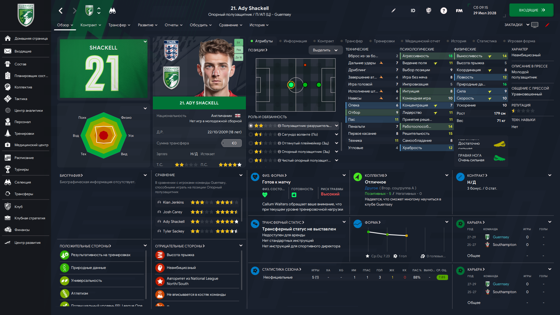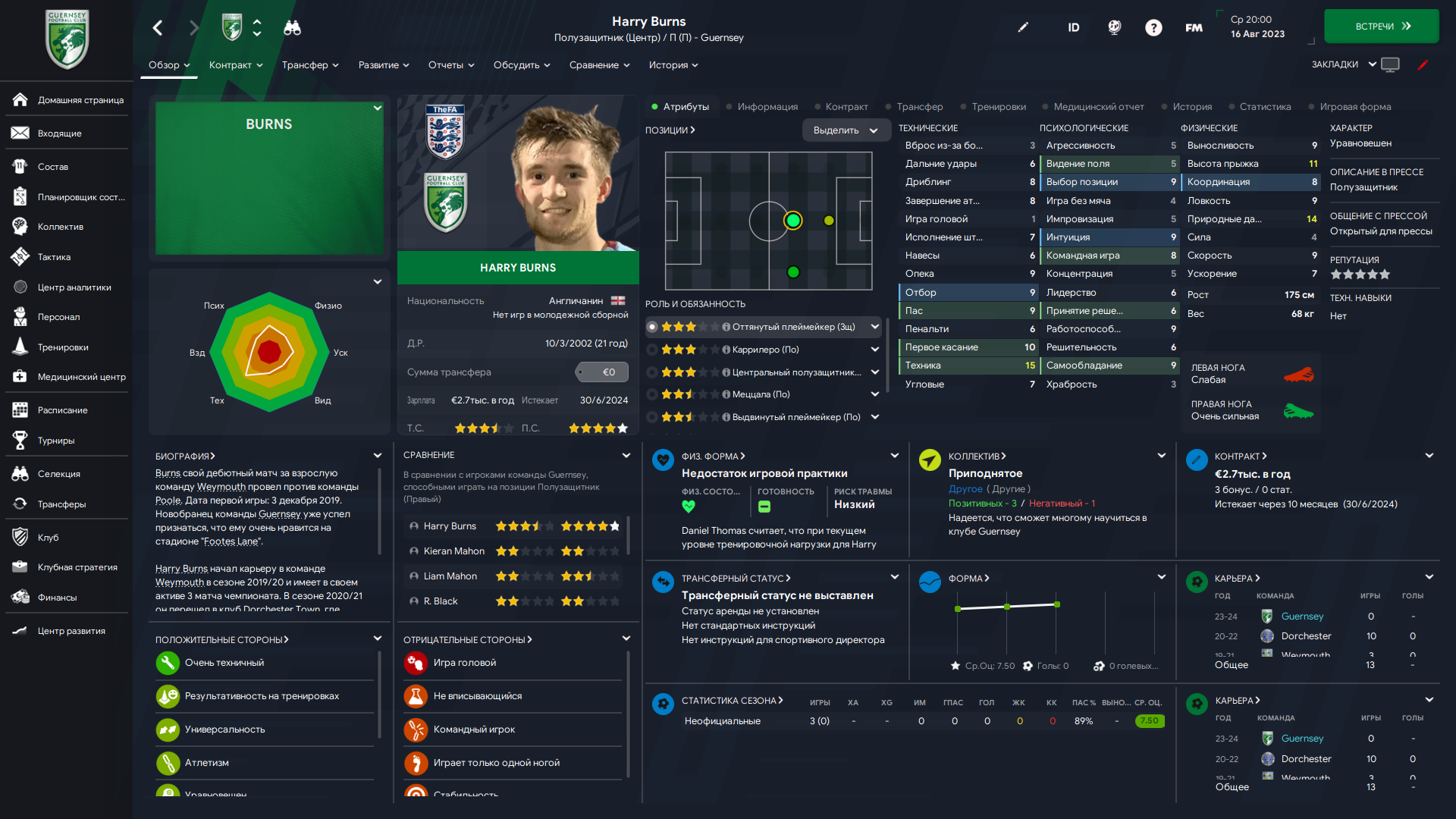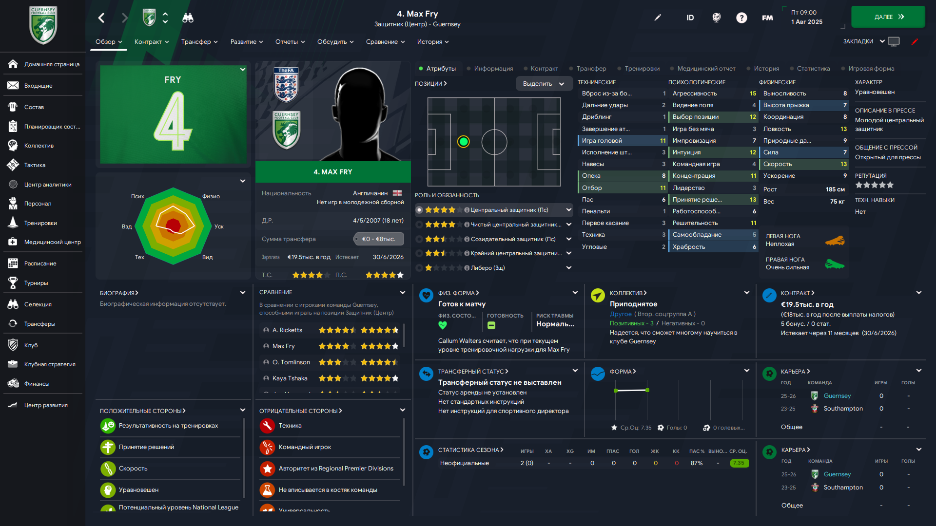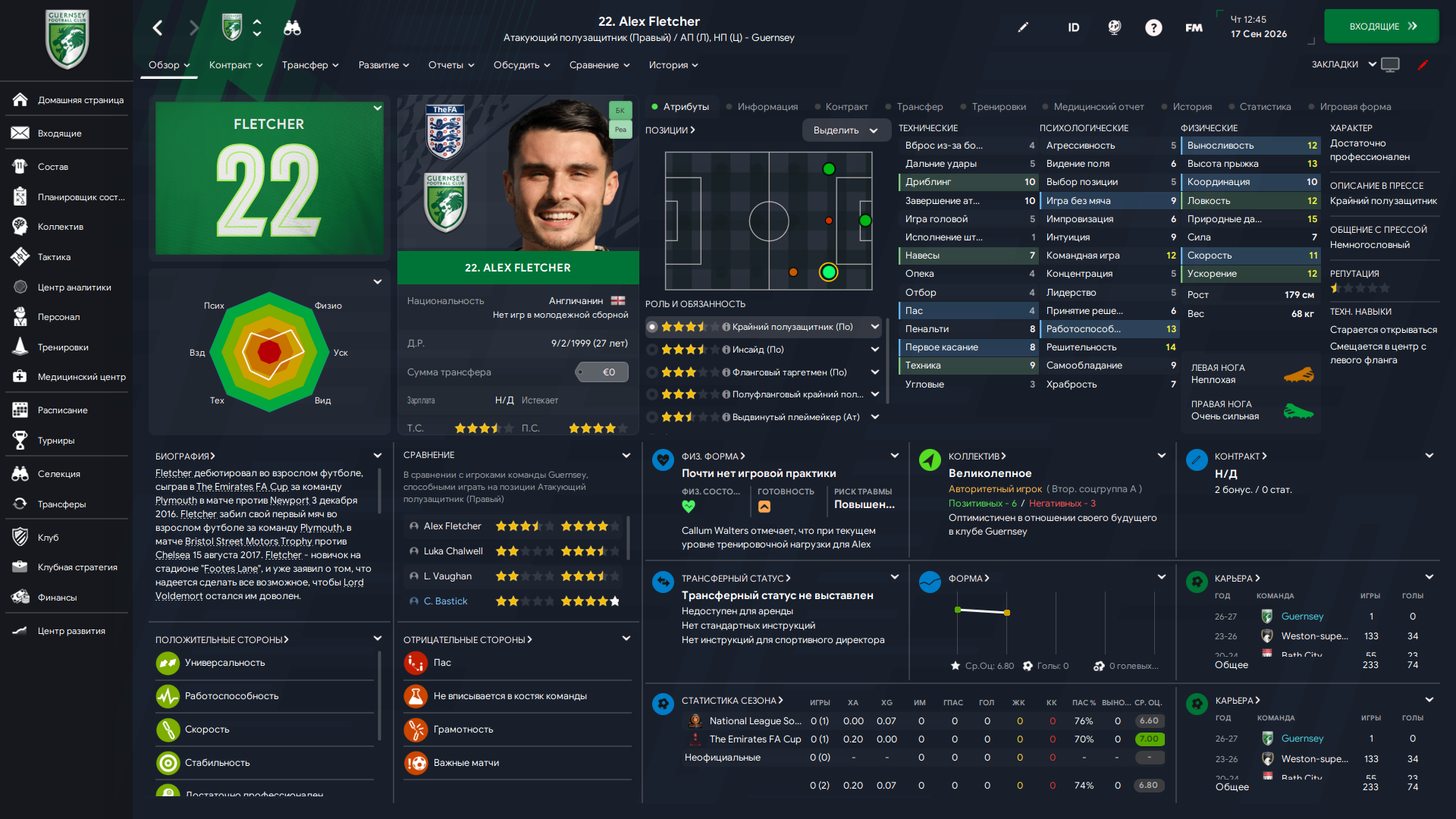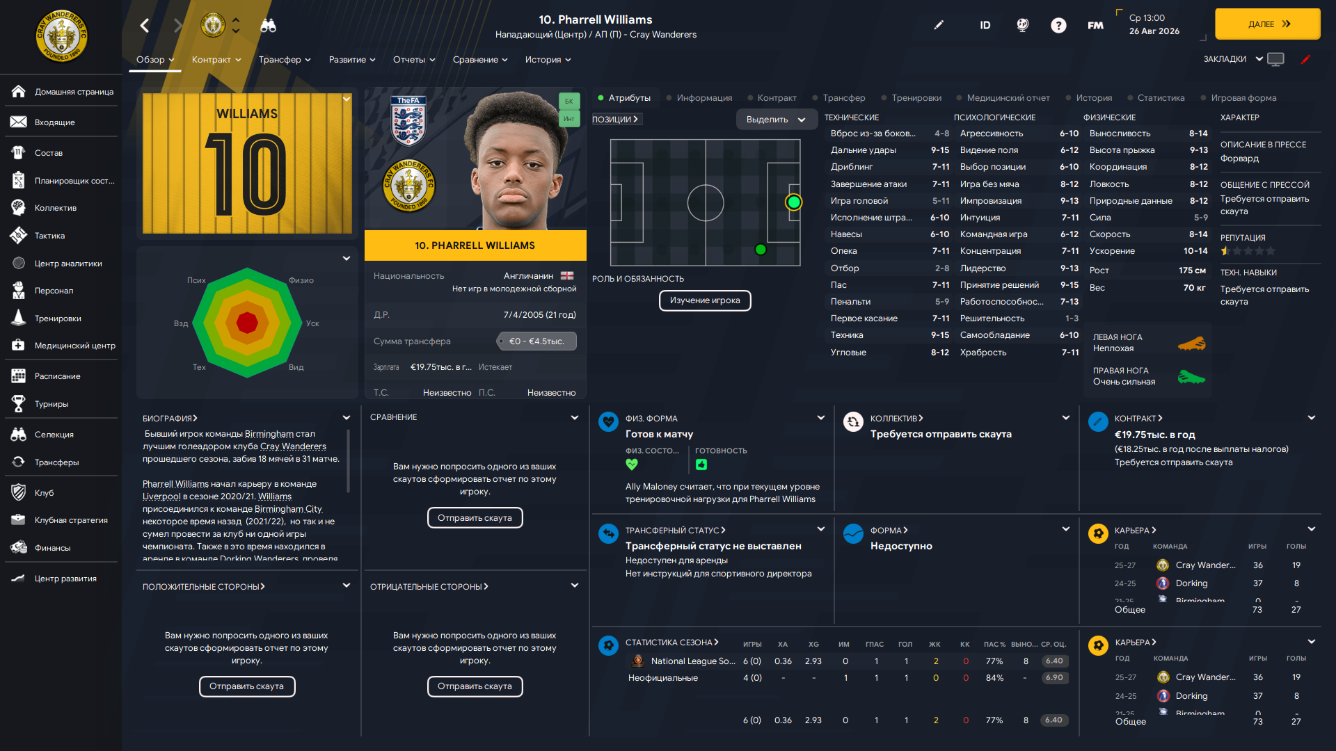 Физически развит, остальное наработаем, надеюсь. Сделал 14 ассистов в 7 дивизионе, к нам перешёл почти за 6 тысяч евро.