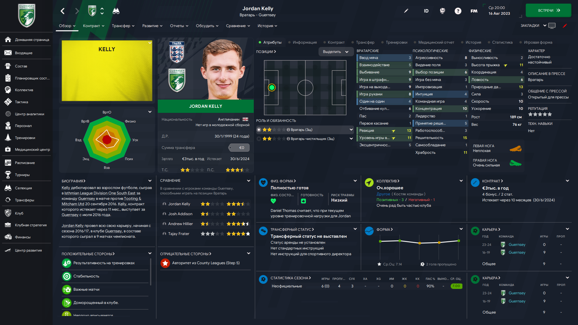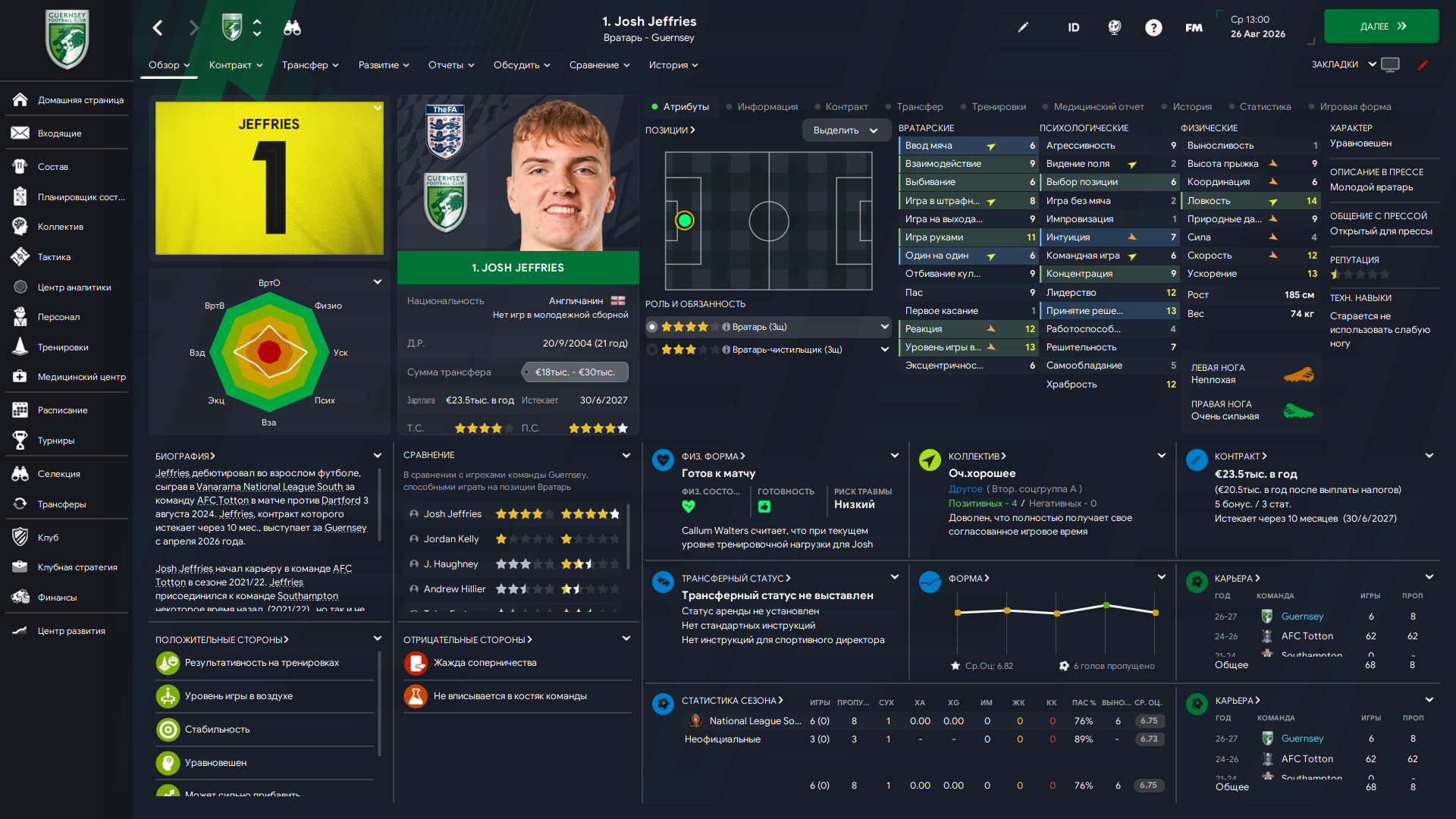 По скиллам лучше прошлого вратаря, но приехал из Эбсфлита, где занял последнее место, пропустив 34 мяча. Другое дело, что Джефрис, занявший с нами 7 место, пропустил аж 58, плюс скауты кипятком писались. Ну что могу сказать, пока получше предыдущего, надеюсь разыграется и раскачается.