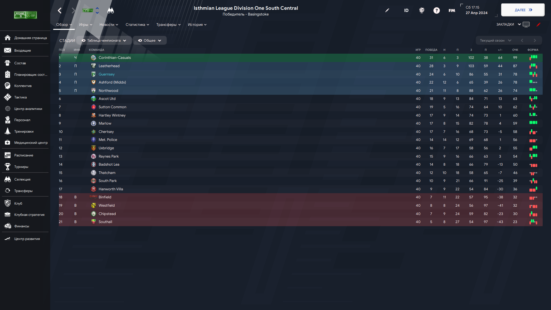 Неплохая первая половина, в начале второй тоже держались, в какой-то момент даже на 2 место вышли, но всё, очень много матчей, уже зимой перегрузы, игроки стали в отпуск уезжать, а потом и вовсе команда закончилась. Не работает ничего, но каким-то чудом мы всё-таки не вылетели из зоны плей-офф и сразимся за билет в Скай Бет 2.