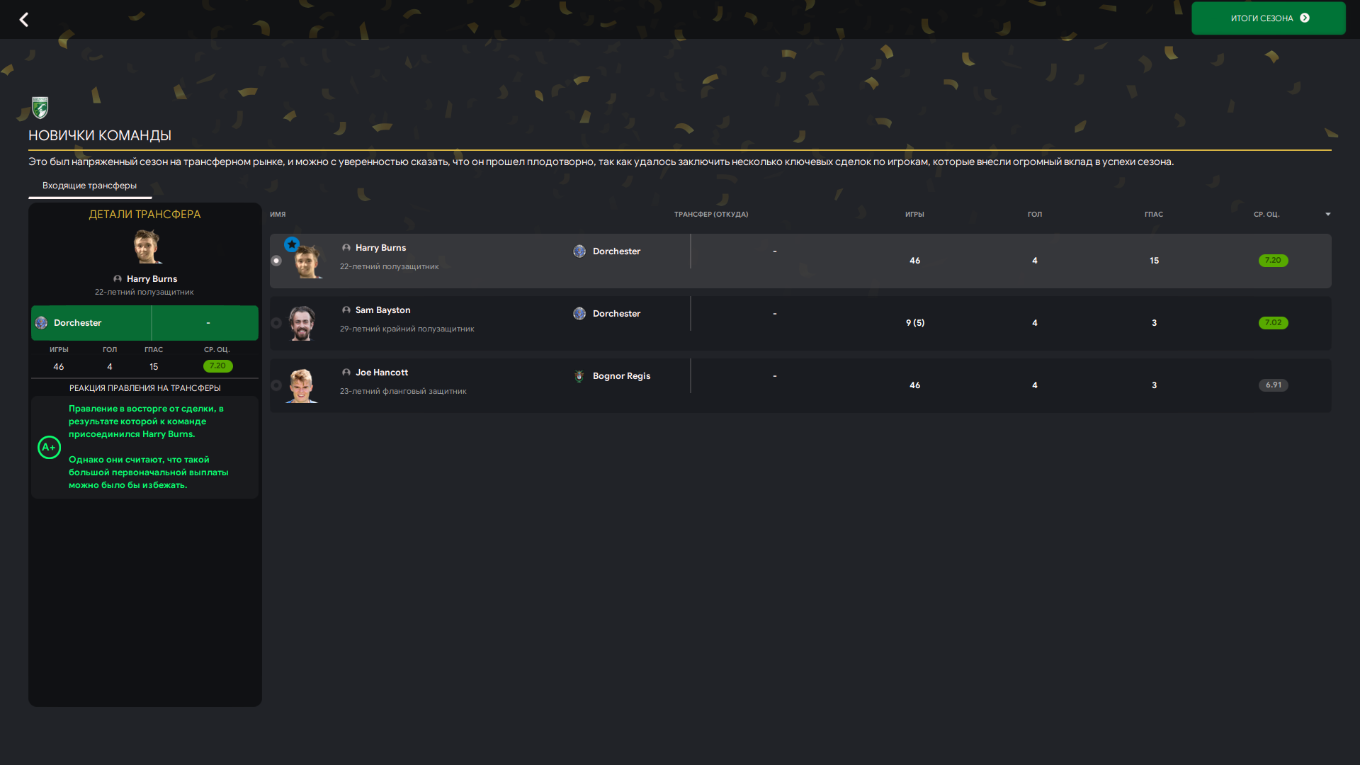 Много игроков осталось с прошлого сезона в основе, добавили фланги и сейчас пытаемся остатки бюджета закинуть в кого-то околотопового, но никто не идёт. Ждём, пока они отчаются без клуба и согласятся идти к нам.