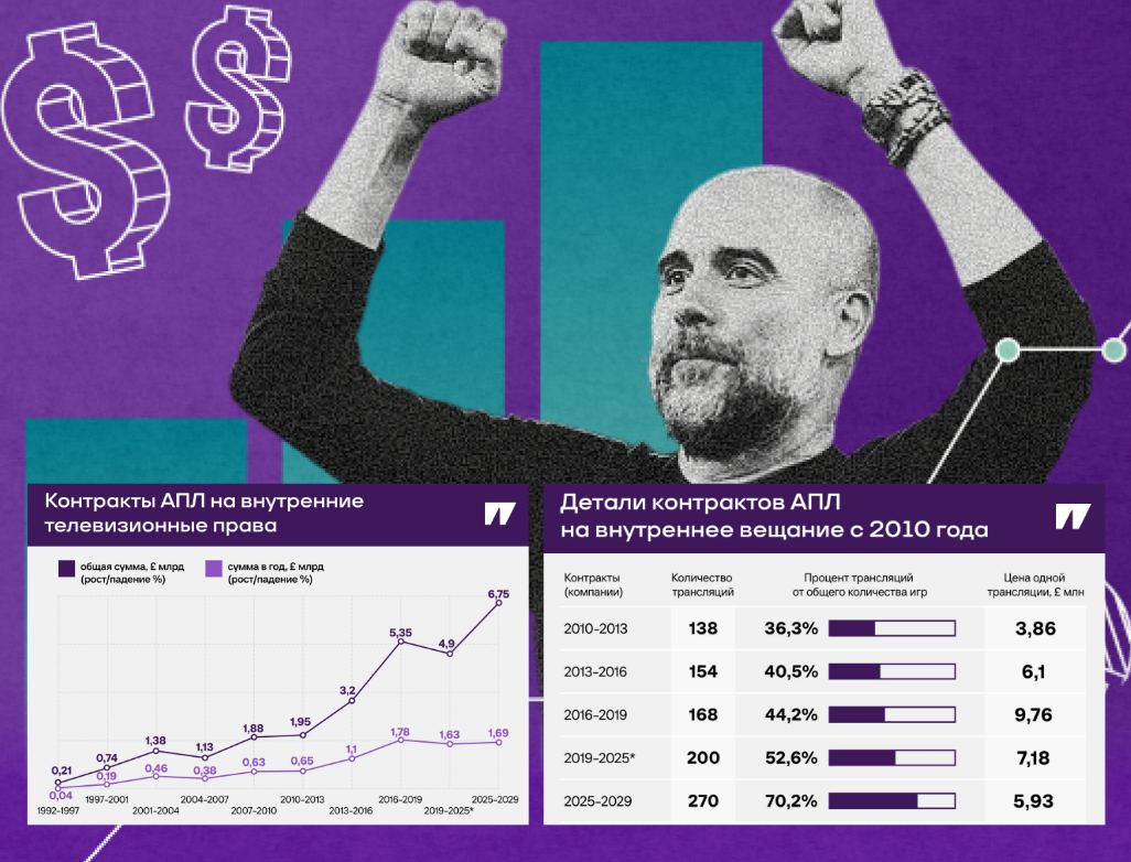 ● Новая сделка на 2025-2029 годы – рекордная по общей сумме (£6,75b). По среднему доходу в год был один цикл успешнее – предпандемийный (2016-2019), когда АПЛ получала от британских вещателей £1,78b против свежих £1,69b