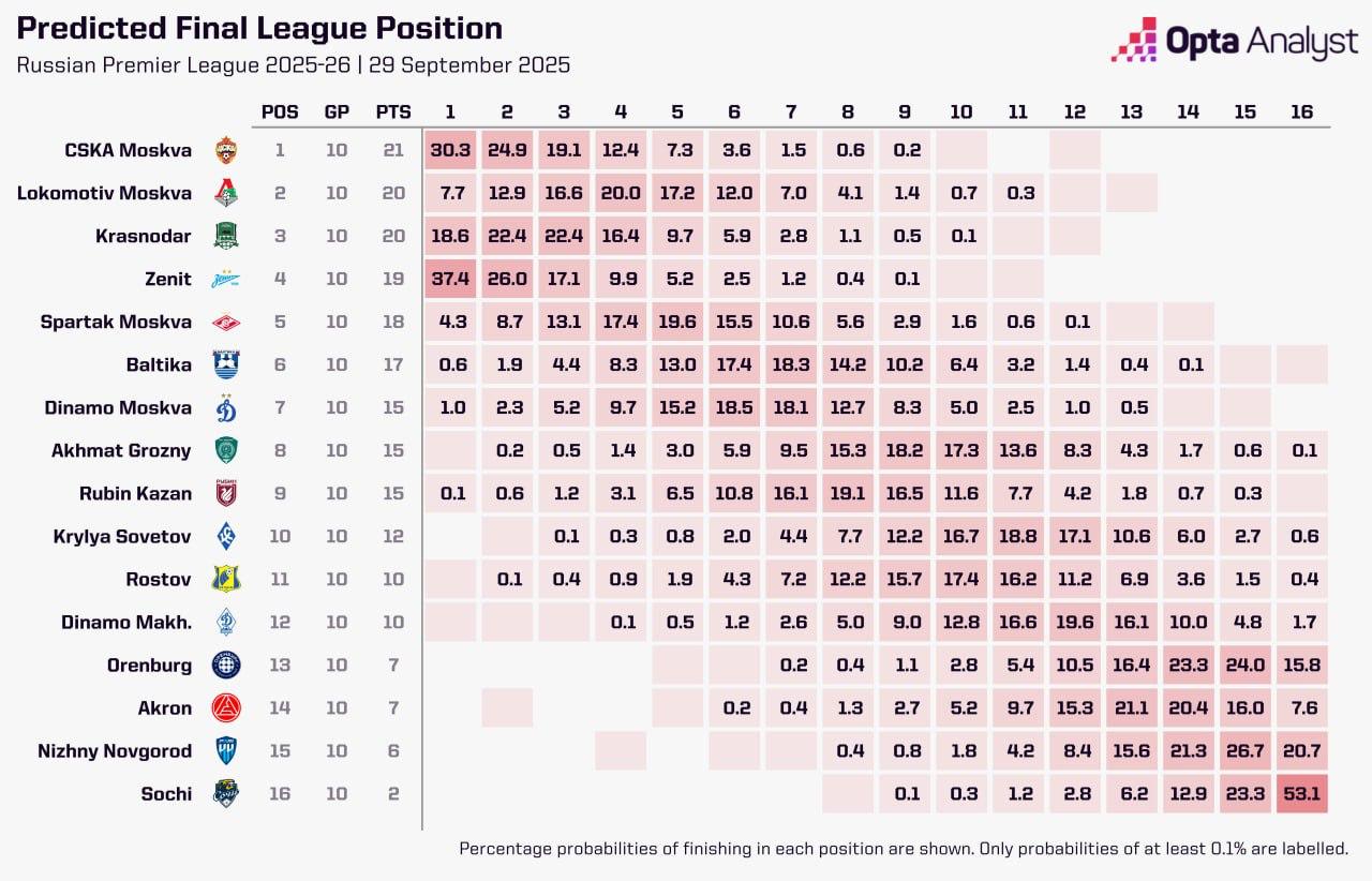 Суперкомпьютер Opta после 10-ти туров РПЛ пророчит Зениту чемпионство, а ЦСКА 2-е место по итогам сезона. На 3-ей строчке расположился Краснодар. Дристачок по традиции поборется с Балтикой и Динамо за шестую строчку.
