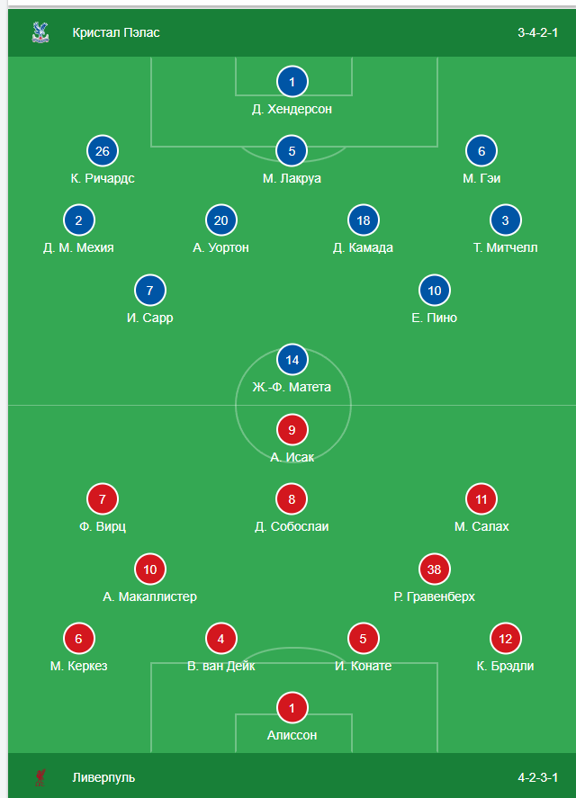 Слот, как обычно, придумал против перекачанных стероидных негров Паласа целое нихуя. Ну Клопп вечно от Шона Дайча терпел, а Слот будет от Гласнера. Виртц + Исак = атака мечты, 300 миллионов сожжены нахуй.