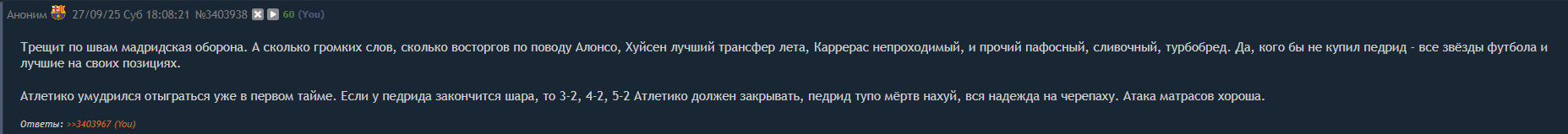 Хочу отметить Алтая. Так искусно подорвать мне пердак - надо постараться. На пару с Аморимом знатно покекали с админа сегодня. Что ж, а я поору с вас долбоебов тут. Порадовал Сиська, наконец-то расчехлил свою летающую залупу. Неожиданно порадовал Крэйг Поусон, получивший снижение степени опидорения за отсутствие ошибок в судействе. Ну и конечно Лабубу с Куньей и Маунтом кажется были единственными кто что-то выпукивал