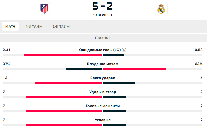«Атлетико» забил 5 голов «Реалу» в официальном матче впервые с 1950 года
