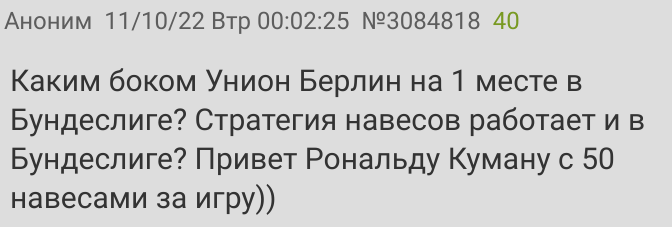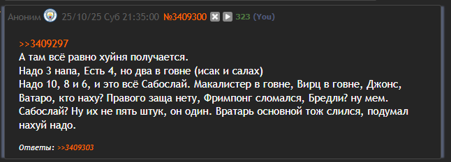 >первая разгромная победа Ливерпуля физрука слопа в сезоне >2 ассиста Виртца >гол Конате Господи Иисусе, какое же несусветное говнище бундеспараша. Это уровень даже не ЧВРП, это уровень ФНЛ. Само собой, Бавария будет там фармить чашки, в их случае позор, что они все матчи чемпионата выиграть не могут. В целом, единственный примечательный момент - слоп наконец-то догадался усадить арабского деда на лавку. Теперь есть какая-то надежда на исправление ситуации. Но в слопа один хуй не верю.