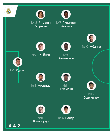 По составу Реала: удивлён присутствием Камавинги и тем что Вальверде всё-таки справа - неужели Трент и Карвахаль до сих пор не восстановились? Ну и вопрос почему бы не выпустить Мастантуоно, чтобы заебать эту дырявую защиту Барсы.