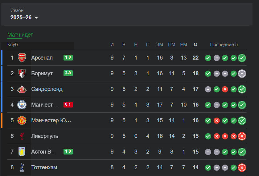 Ливерпуль: 1 тур забил первым (вин) 2 тур забил первым (вин) 3 тур забил первым (вин) 4 тур забил первым (вин) 5 тур забил первым (вин) 6 тур пропустил первым (луз) 7 тур пропустил первым (луз) 8 тур пропустил первым (луз) 9 тур пропустил первым (луз?)
