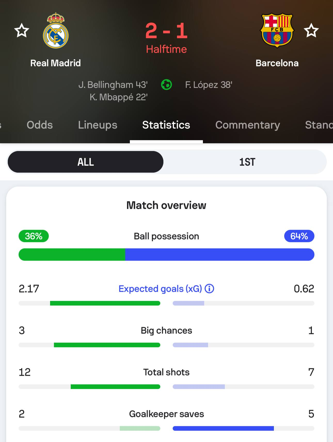 много шансов проебали, это хуево с такой дерьмовой обороной. У барсы тоже хуевая оборона, но они свои моменты все реализуют. А так заебись игра, Гюлер и Каррерас только омрачают своей нервозной игрой. Первого точно менять надо, он все равно только пасы на Мбаппе годен отдавать. А это может и Белингем сделать