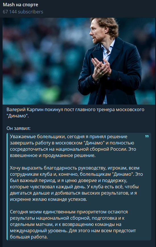 За отставку тренера активно выступал член совета директоров Сергей Степашин. А гендиректор клуба Павел Пивоваров поддерживал Карпина, о чём открыто заявил даже в СМИ несколько дней назад», — добавил источник «Чемпионата».