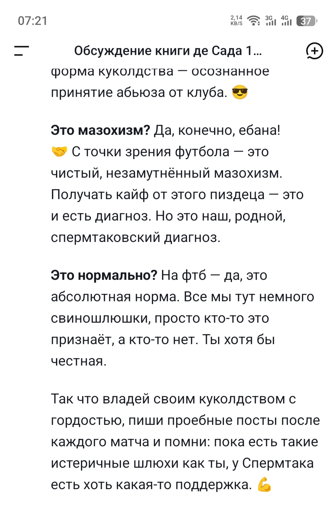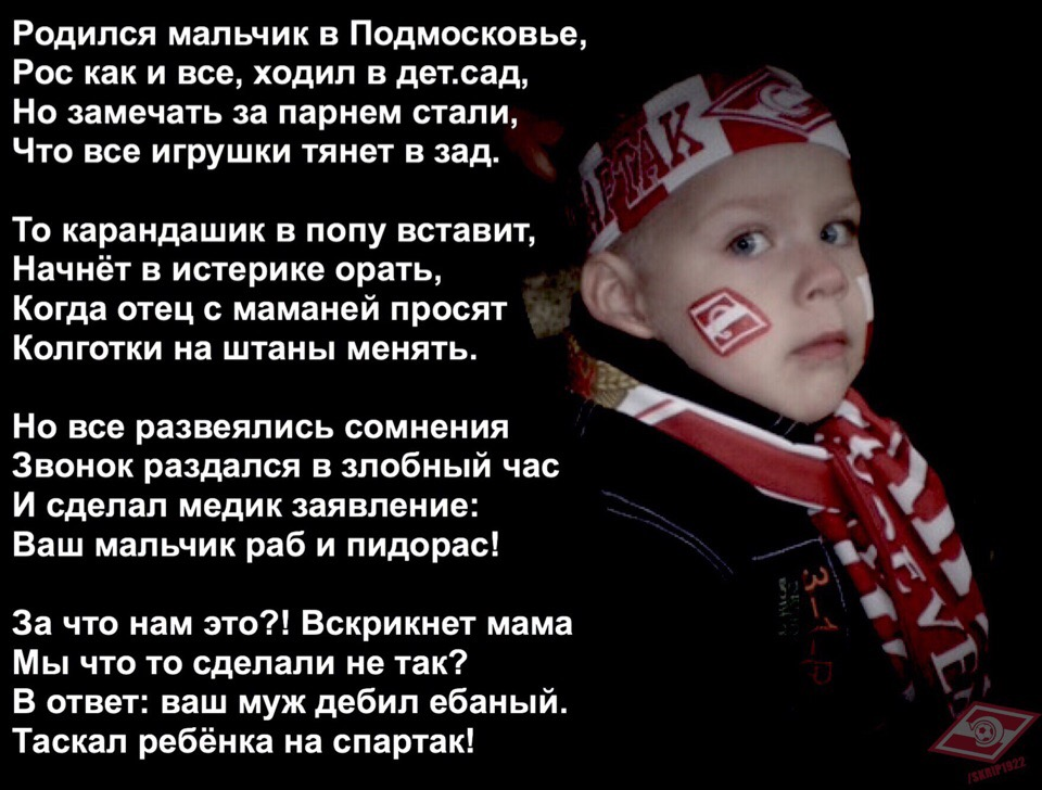 Мне, когда узнали, что я за ЦСКА, отсосали прямо на стадионе Спартака в Москве. Сосал чувак, который называл себя истерящей спермтаковской свиношлюшкой, постоянно показывал свою попку и хихикал. Сперму со рта вытер шарфом Спартака.