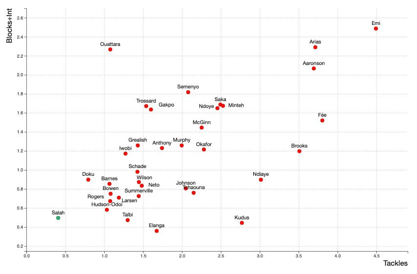 Ливерпулю везет, что существуют саудиты — вместо токсичного актива, который съедает 400к в неделю, они получат сумму, за которую можно будет купить приличного игрока. Салах подзабил на оборону даже больше относительно предыдущих сезонов (за последние шесть сезонов АПЛ ни один вингер с 1000+ минутами не вступал в отбор в пересчете на игровое время и владение реже, чем египтянин), но при этом не компенсирует это впереди — по его меркам это слабый сезон, хотя по обычным стандартам у него вполне приличные результаты (0.35 результативного действия без пенальти в 90 минут, 70+ перцентили по продвижению пасом и ведением), просто не на вторую зарплату в лиге.
