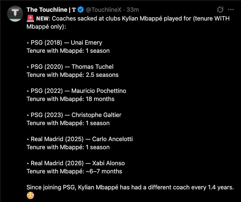 >>3426862 >Недооценная цифра дня: с момента перехода в «ПСЖ» у Килиана Мбаппе новый тренер появляется каждые 1,4 года.