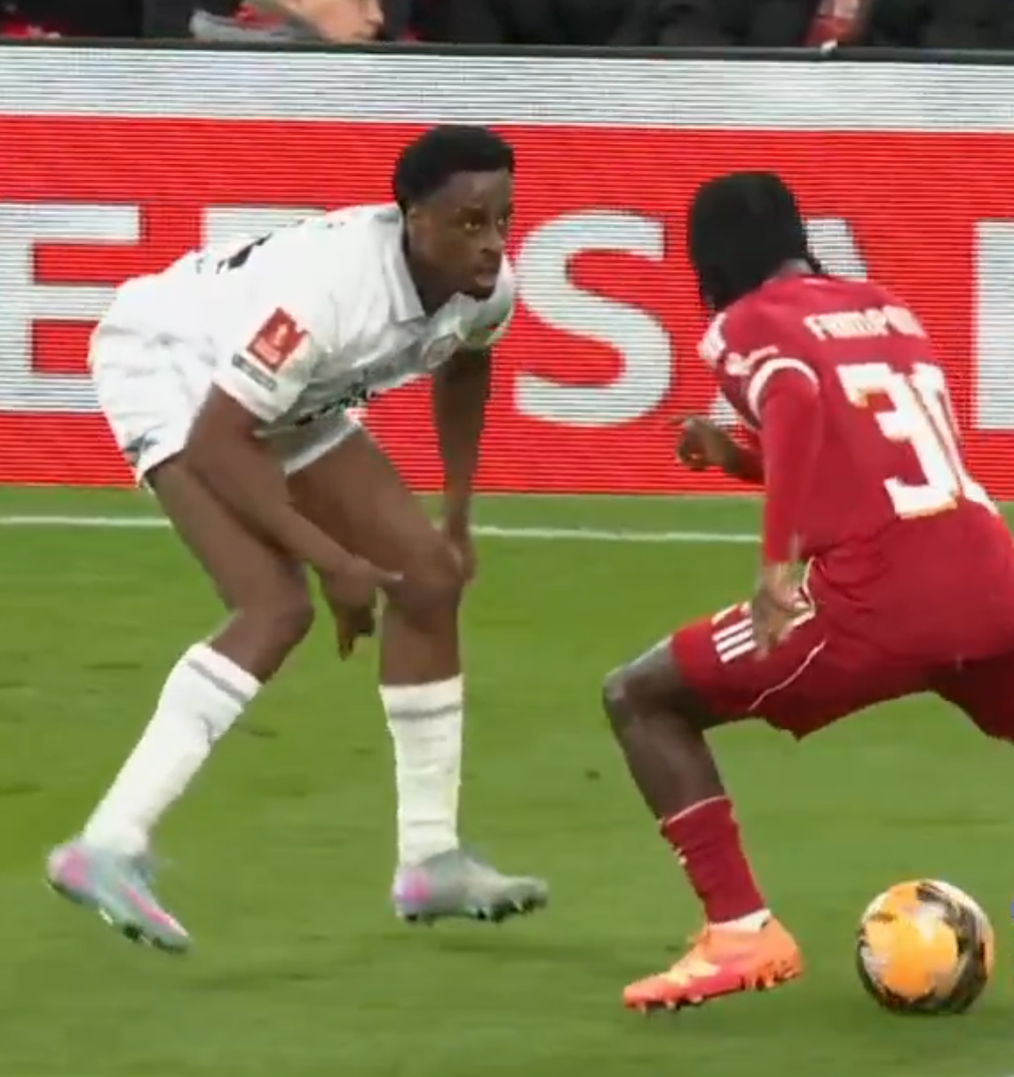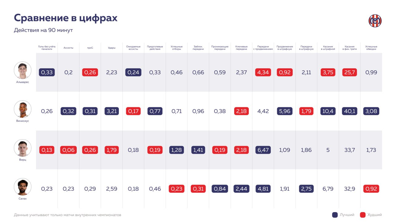 Но Альварес не выделяется на их фоне. Успешные отборы реже, чем у Винисиуса, а в штрафной встречается с мячом реже, чем Вирц. Не идет в дриблинг, не бьет. Опускается глубже, чтобы помочь с продвижением мяча. Но он даже внутри команды не является лучшим по этим показателям