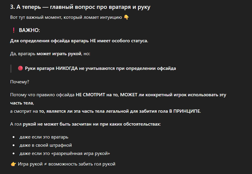 >>3427390 Мне вот теперь стало интересно. Офсайд же чертится по той части тела которой по правилам можно забить гол. И вот если вратарь предпоследний игрок и выставит руку за линию офсайда, будут по ней чертить? Он же в теории в своей штрафной может забить рукой гол. Или будут чертить всё же как у полевого игрока? По ногам, плечам, башке и жопе?