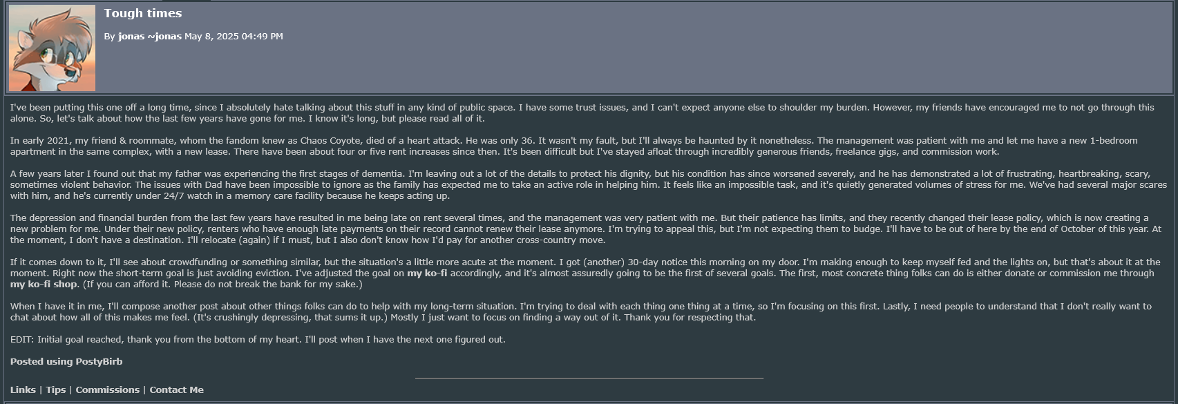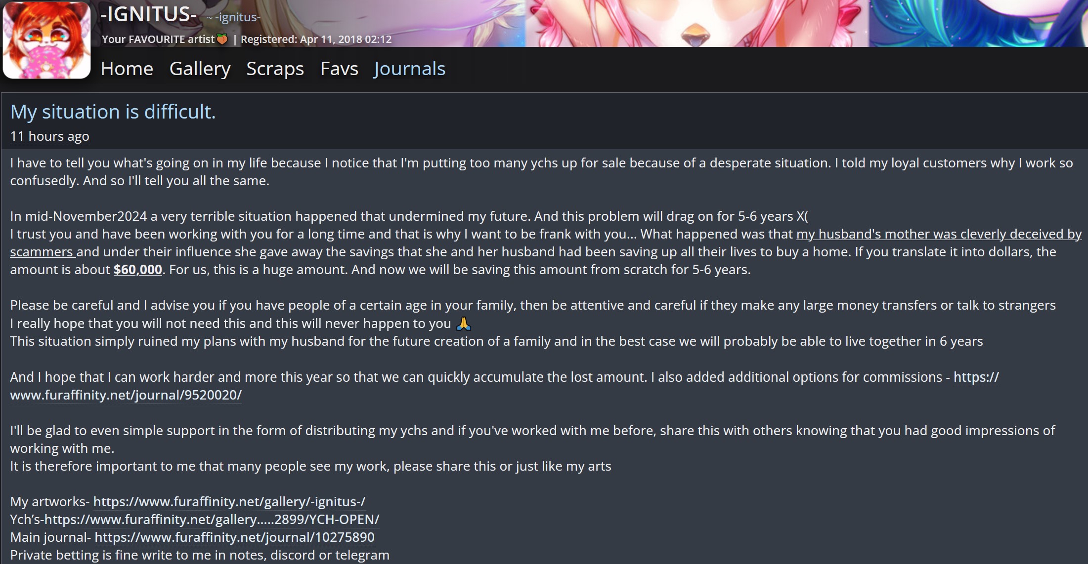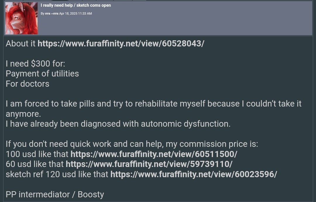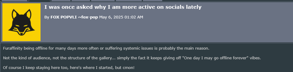 Furaffinity сломан, и пока его чинят, на главной уже несколько дней висит чей-то продаваемый персонаж. https://www.furaffinity.net/view/60737614/ У некоего ГромовогоДракона знатно полыхает от такого бесплатного и несправедливого пиара.