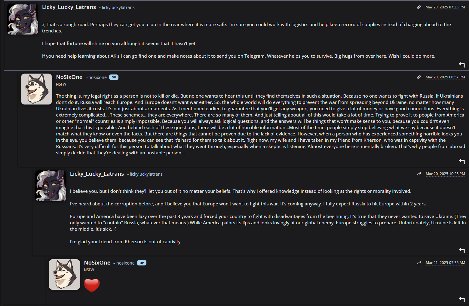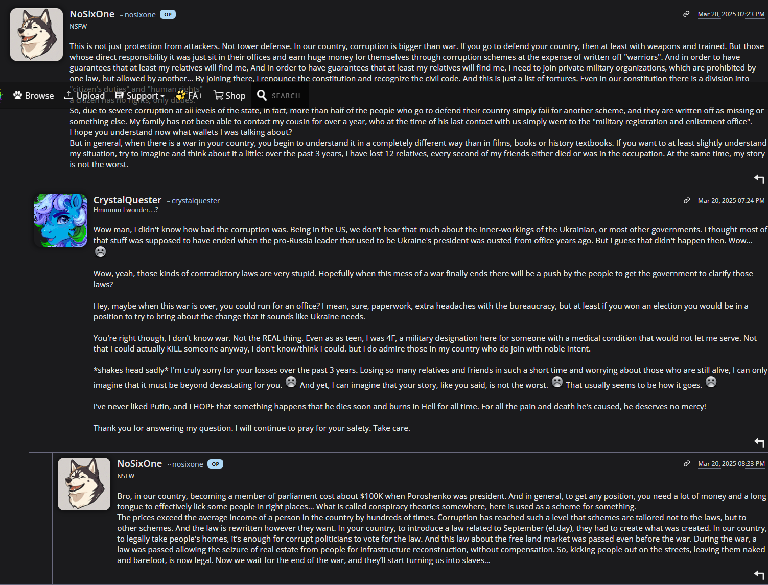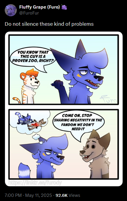 >>398080 Здесь уже давно не обсуждают ничего фуррёвого. Единственный живой сайт который посещают фурри это Х, на всех остальных боты постят и боты смотрят.