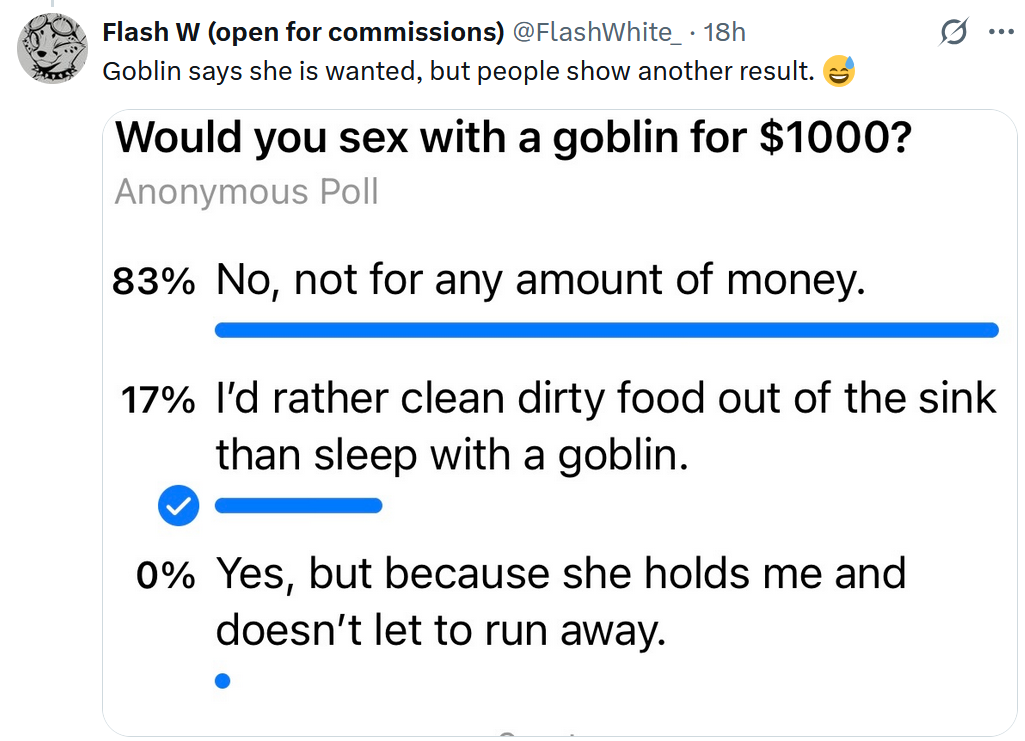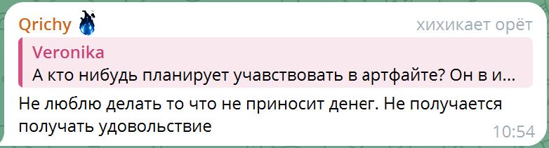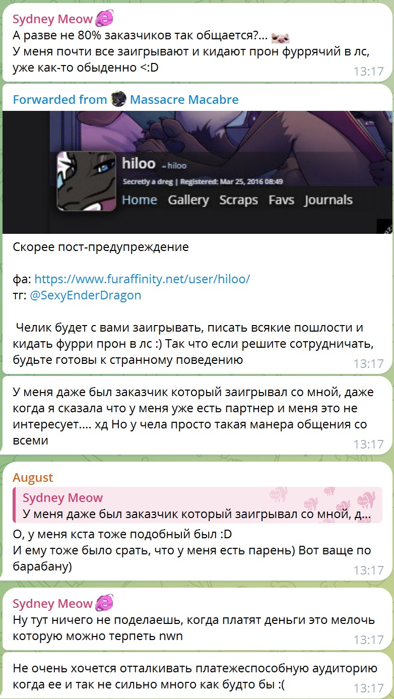 >>391527 >Свой вклад я лучше внесу фанартами по излюбленному контенту Так это ты. А у них буквально философия что нихуя рисовать не буду, пока денюжку не заплатите, и себе не буду, а если нарисую, то закрою за самыми огромными пейволами, чтобы всё равно оплатили, а то хуле бесплатно рисовать. Т.е. буквально нету никакой эмоциональной вовлеченности, просто работа, просто линии мажу которые скажут. >но мне тяжело поддерживать общение, особенно неформальное. Это то ладно. РПшить с заказчиками это дело такое. Но там же буквально "Я рисую арт для дрочки, и я узнаю, что заказчик на этот арт дрочит, фу какая мерзость, как эти извращенцы могут дрочить на арт с еблей, отвратительно, ничего не хочу общего с ними иметь. А уж если они скажут что подрочили на мой арт, аж тошнота берёт, словно только что изнасиловали." Т.е. фурри это буквально содрать далары с богатеньких аутистов кумеров. Как твитч стримерши с открытыми бубами которые показывают как интересно им в игры играть, но ты главное донать, хихи. Какие-то асексуалы аутисты зачем то вкатываются в рисование порно. Хотя понятно зачем, изи мони.