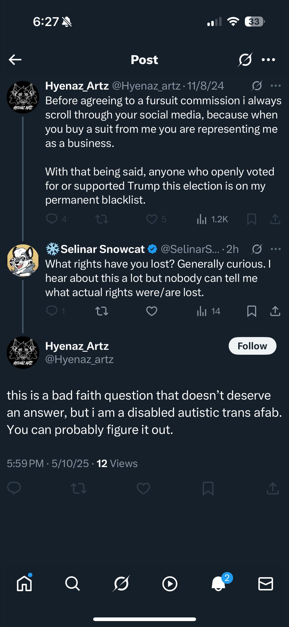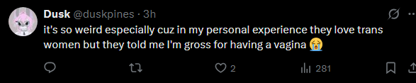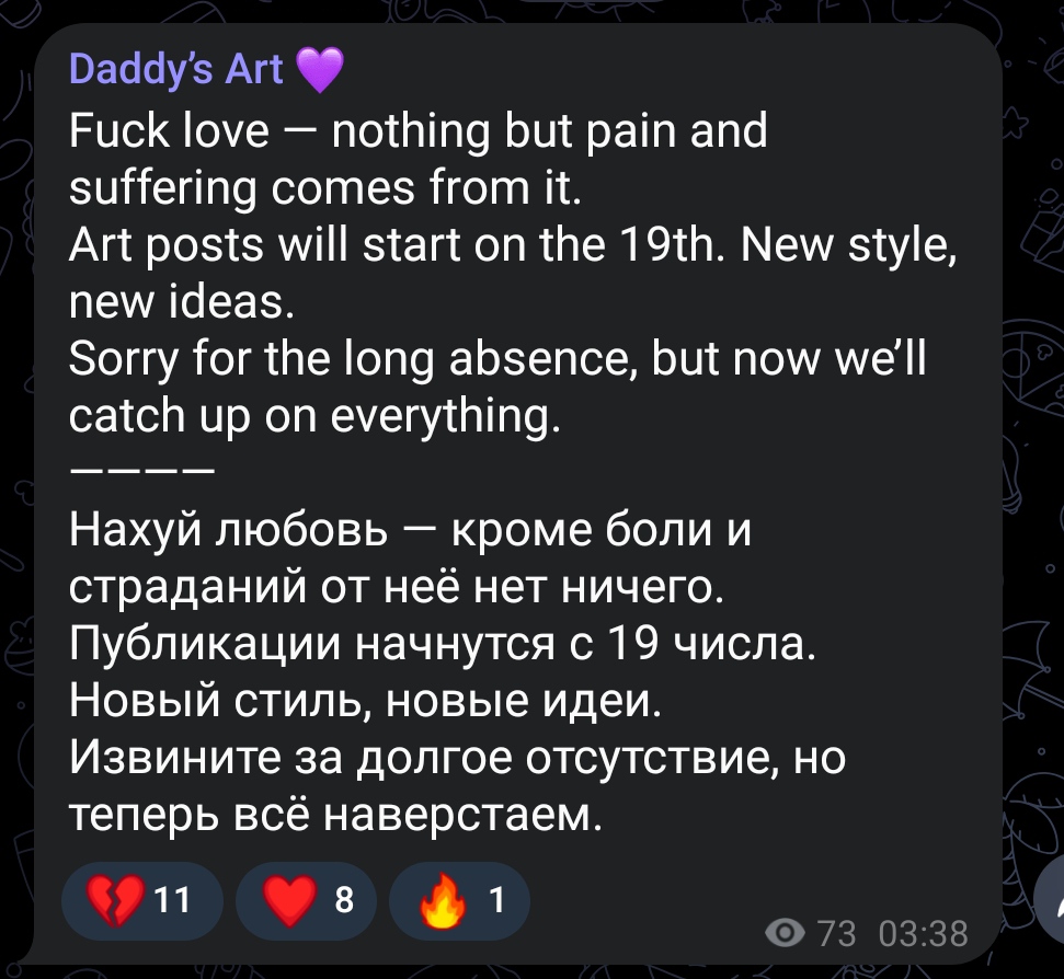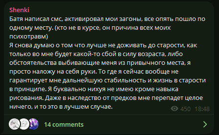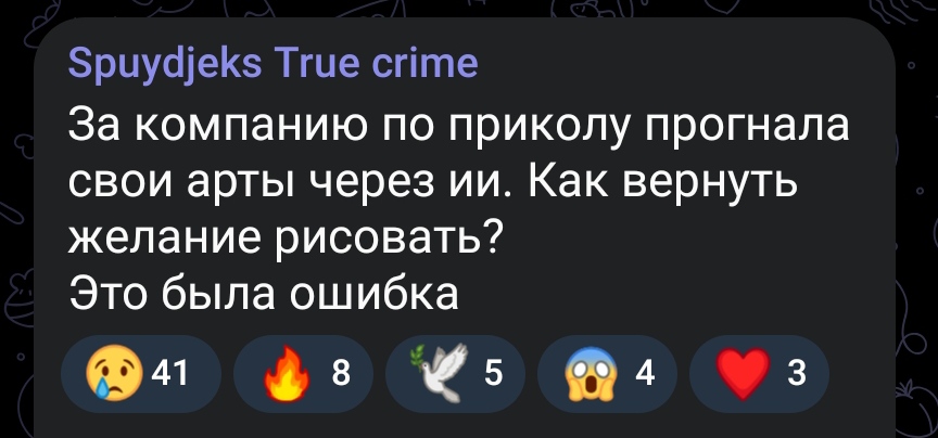 псиносрач - не взлетает ребенкосрач - не взлетает совмещенный псино- и ребенкосрач - и тот не взлетает! Проклятые подписчики, проклятый Маск, проклятый алг0ритм! Не ценят художников, гнобят! А? Чо? Рисовать? Не, я самый тяжело больной в мире человек. Вот вам репосты репостов старых работ и одна випка в год, отъебитесь.