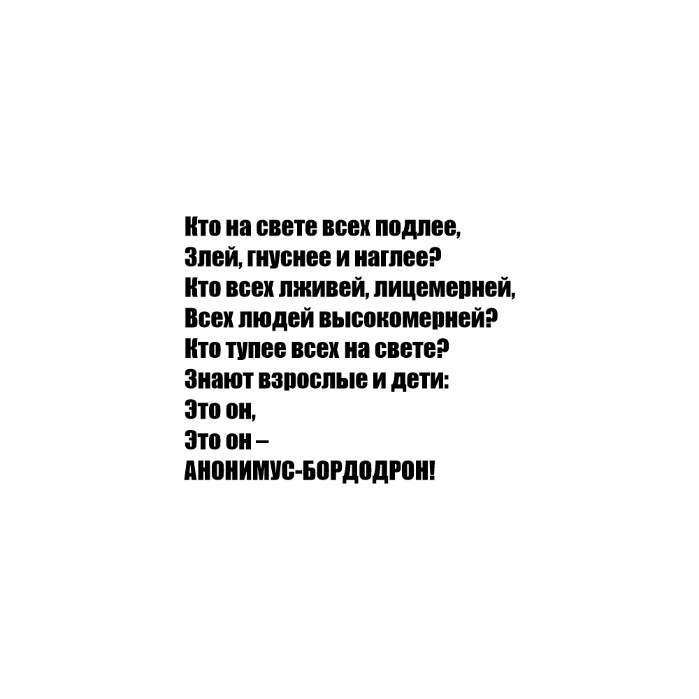 >>391569 У тебя комикс про само явление троллинга в целом, подкреплённое анонимностью в сети. Анонимусом можно сделаться везде, просто указав заведомо ложные личные данные о себе или не указав таковых вовсе. Надо тогда каждого в интернете ненавидить, ведь за доброй аватаркой и приятным слогом может быть злосчастный тролль. Ты ещё, наверное, из тех, кто за выход в интернет по паспорту.