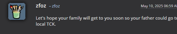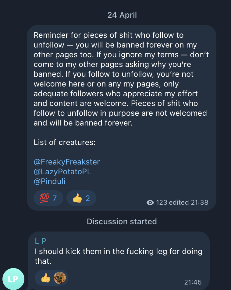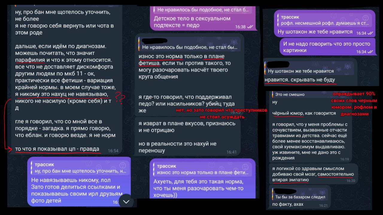 Начав копать глубже мы обнаружили, что у трассы не только есть куча нездоровых наклонностей (можно было бы в этом случае просто баном обойтись), он еще и делится "историями педофилов" (которые являются сборником подробных описаний насильственных актов над детьми) на своем канале, и показывает своим рж друзьям фото того же характера (один из друзей трассы прямо подтвердил, что тот показывал ему "секс картинки" с детьми, в реальной жизни). Пруфы все мы предоставили трассе, он подтвердил что все из вышеперечисленного является правдой, при этом все еще говоря о том, что никому ничего не навязывает и распространением не занимается. (Что не сходится с его действиями)