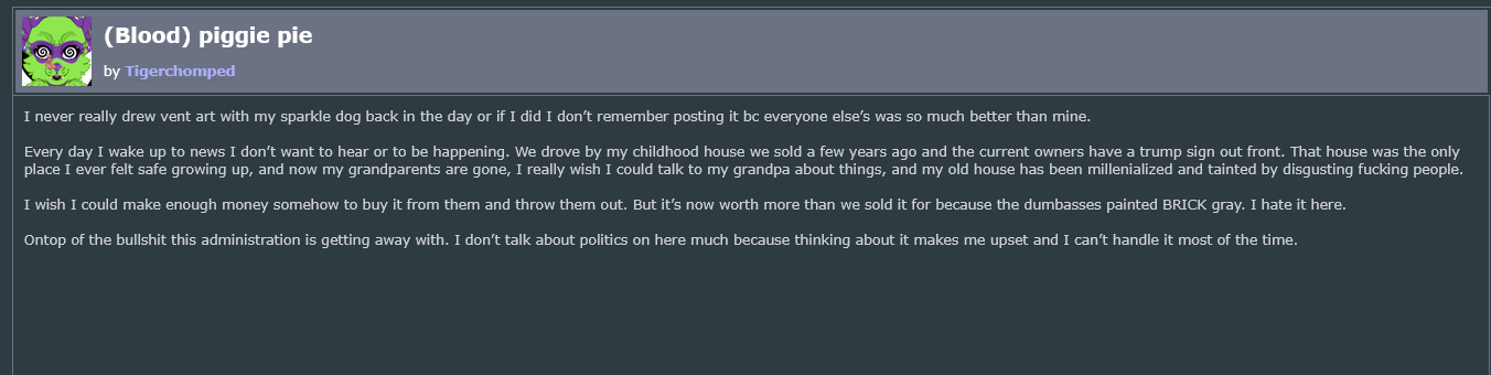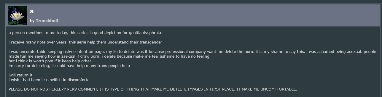 >>391379 Да там драмы-то хоть и вонючие громкие, но в основном типичные такие, бытовые для фурри-художника разве что он в них со стороны обидчика чаще выступал, а скулёж поднимал только когда у него арты пиздили, как в случае с утечекой вообще всех работ и wip-ов из личной папки в Dropbox-е. Никаких чучел собак для ебания или гомозоопедофильского порно. Просто талантливый художник и при этом слегка быдловатая личность.
