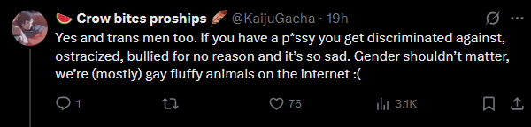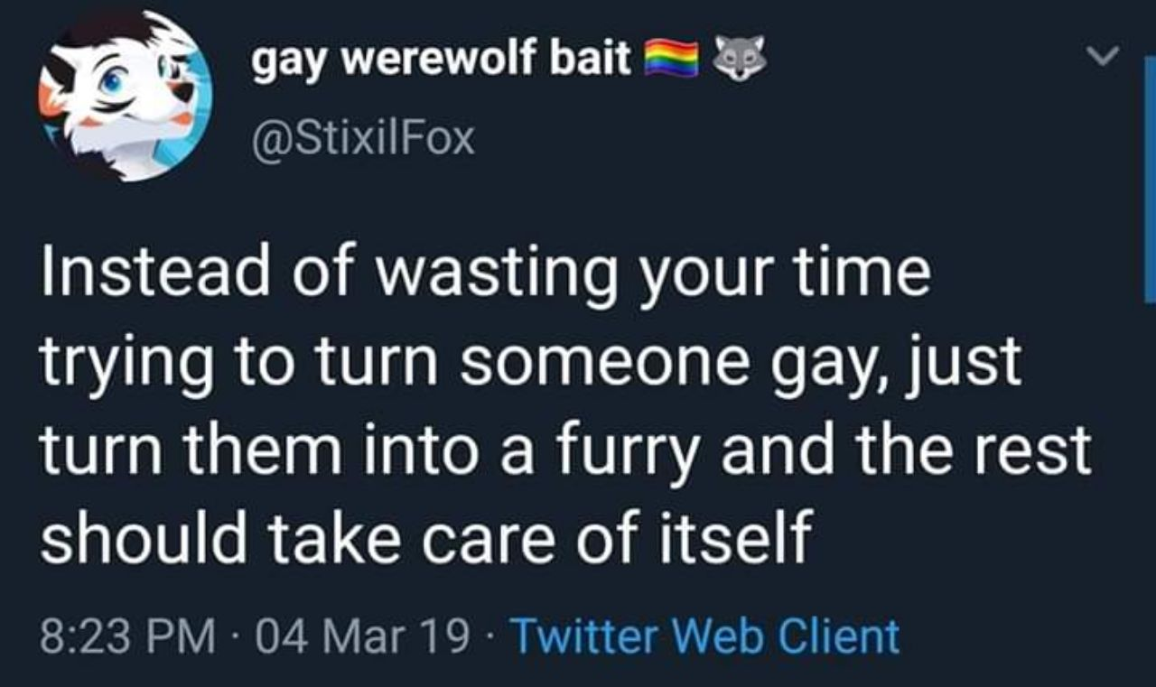 >>398100 С этим неплохо справляются членодевки и фембойчики, никаких фуррей не надо. Даже на бордах в какой то момент в разделе фетишей было засилие тредов "Отсос для натуралов" "ебля в жопу для натуралов" "поцелуи с другим кунчиком для натуралов" "сожительство с парнем для натуралов", было так много, что их потом всех наконец то выкинула в ga