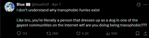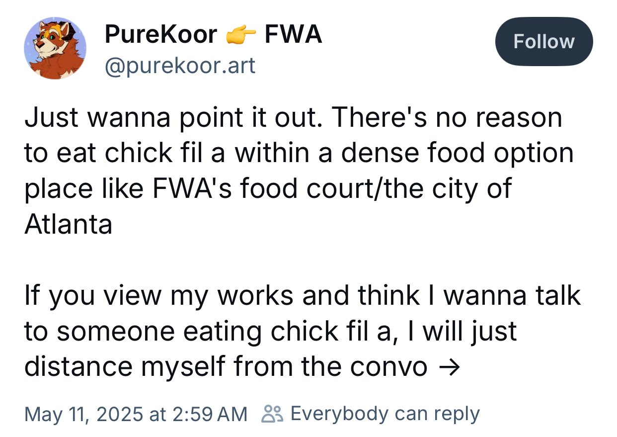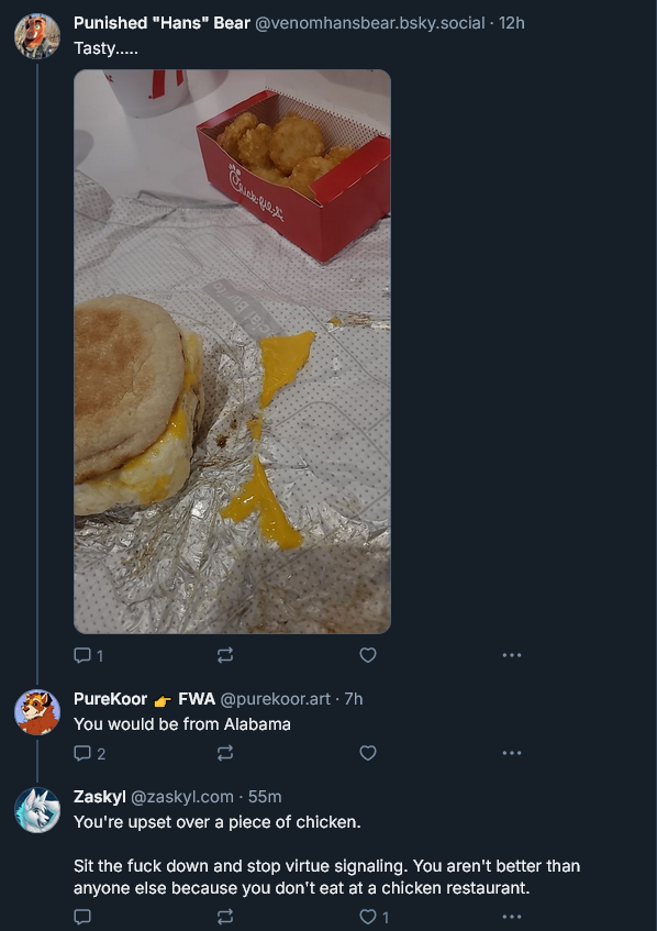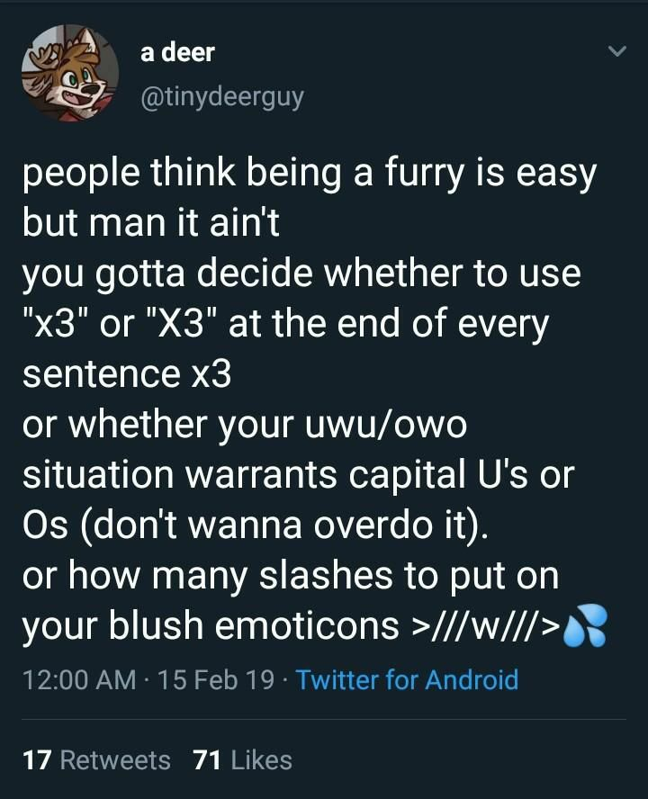 >>397475 А почему все эти уходимцы с Х всё еще там бугуртят, а не лампово сидят в своём блюсике? Ну и еще конечно охуеть, сейчас бы быть фуррём хищного вида и копротевляться за веганство. Или с Чикен Фил А какая то другая история?